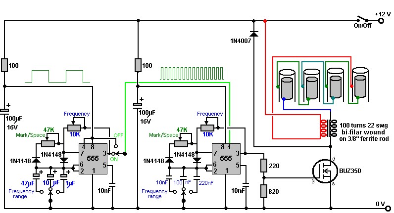 A 10mm-es ferritrúdon a bifiláris tekercs trafóként funkcionál, AC lesz a DC-ből. A rajz szerinti bekötésnél elvileg azonos pólusú DC tüskét okoz. Ki fogom próbálni.