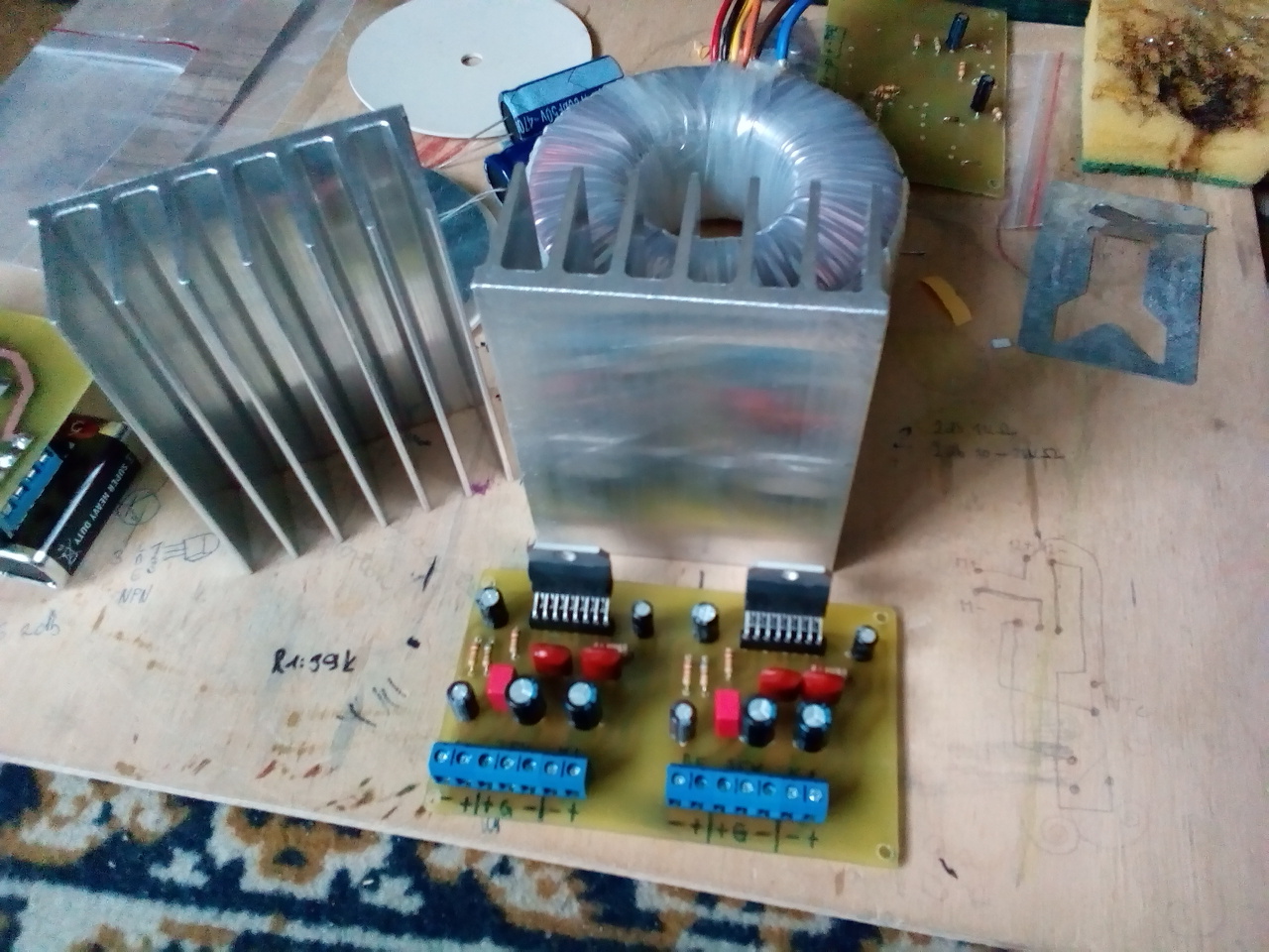 A szimmetrikus tápban lévő pufferek értékét javaslom IC-nként 1-1db 4700µF értékre választani. Másképp fogalmazva, mindkét erősítőnek legyen 1-1 kondija (én ezt így próbáltam megoldani).