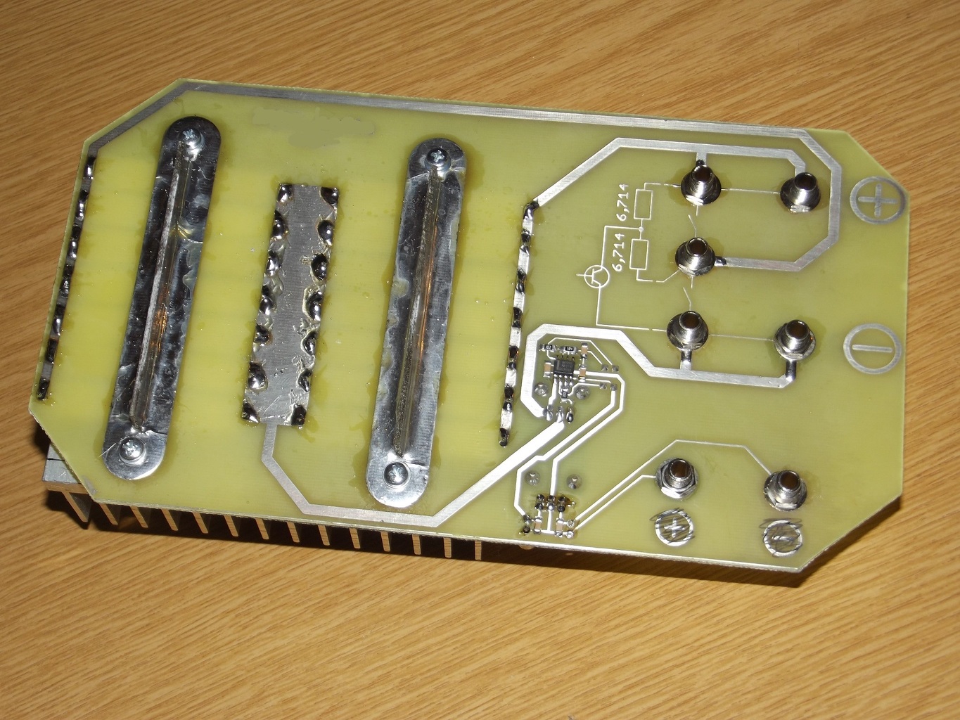 Néhány napja én is építettem egy műterhelést, na nem olyan komolyat mint amiről legutóbb volt itt szó. 14db 10W-os huzalellenállást ültettem egy panelba és rászorítottam egy hűtőbordát. A nyákon pedig van egy kis áramkör 555-tel ami ha szükséges akkor a terhelést tudja kapcsolgatni 40Hz-en, de a banánhüvelyek közti híd variálásával R2R mérésre is befogható. Ez a kis áramkör kimondottan labortápegységek dinamikus viselkedésének vizsgálatához készült.