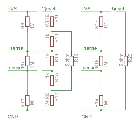 A váltás okoz gondot, a referenciát és a feszültségosztót is váltani kellene a két pont között. Arra gondoltam, hogy alapból, normál kábelnél 1M-os ellenállások állítanák elő a referencia feszültséget, ha pedig speciális kábelt csatlakoztatok, akkor az 1K-os ellenállások miatt megváltozna az 1M-okon levő feszültség.
