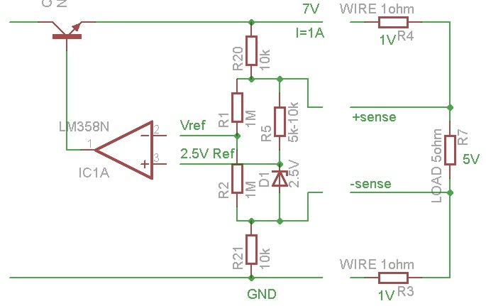 Ez a megoldás már működőképesnek tűnik. Ha nincs csatlakoztatva a két plusz sense vezeték, akkor a csatlakozón áll be az 5V, ha van csatlakoztatva, akkor a kábelen feszültség esik, a kábel végén levő feszültséget visszavezetem a feszültség osztókra. A kisebb feszültség pedig 10k-val kapcsolódik az eredeti feszültséghez, így nem módosul az értéke. Ez működőképes vajon?
