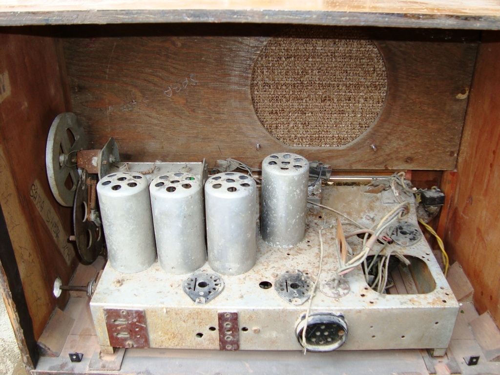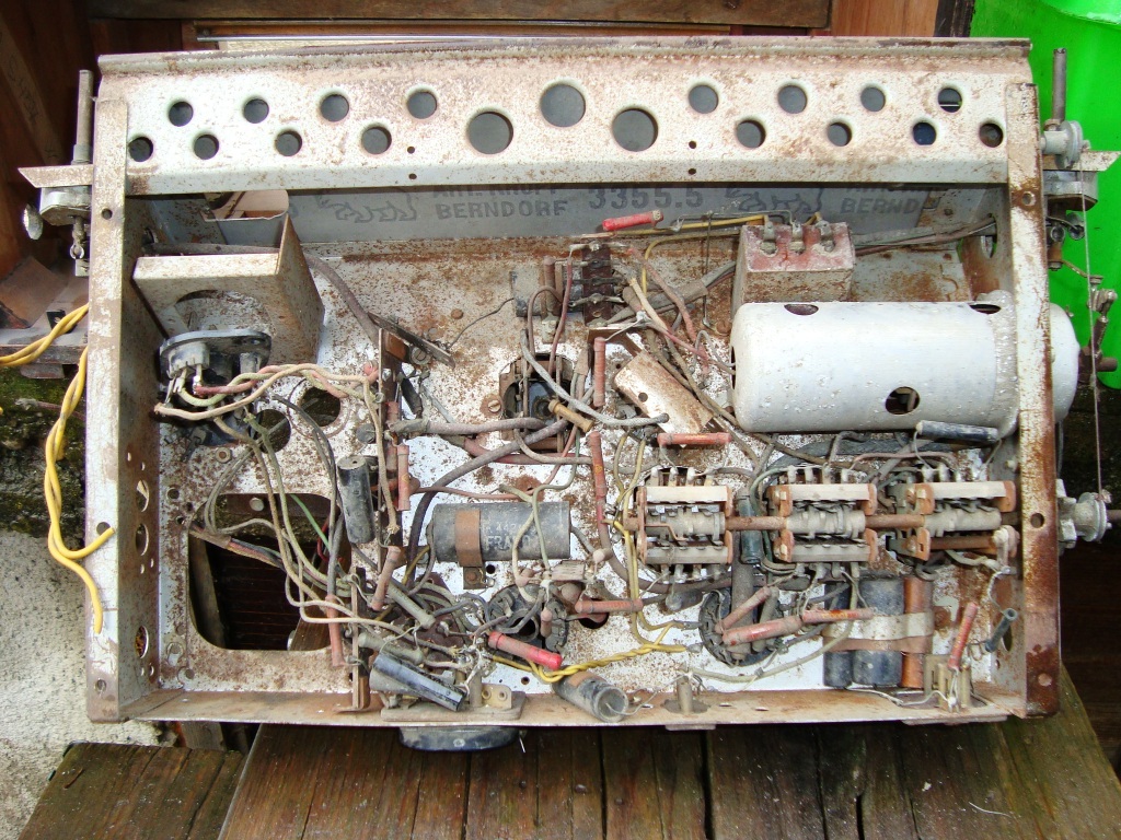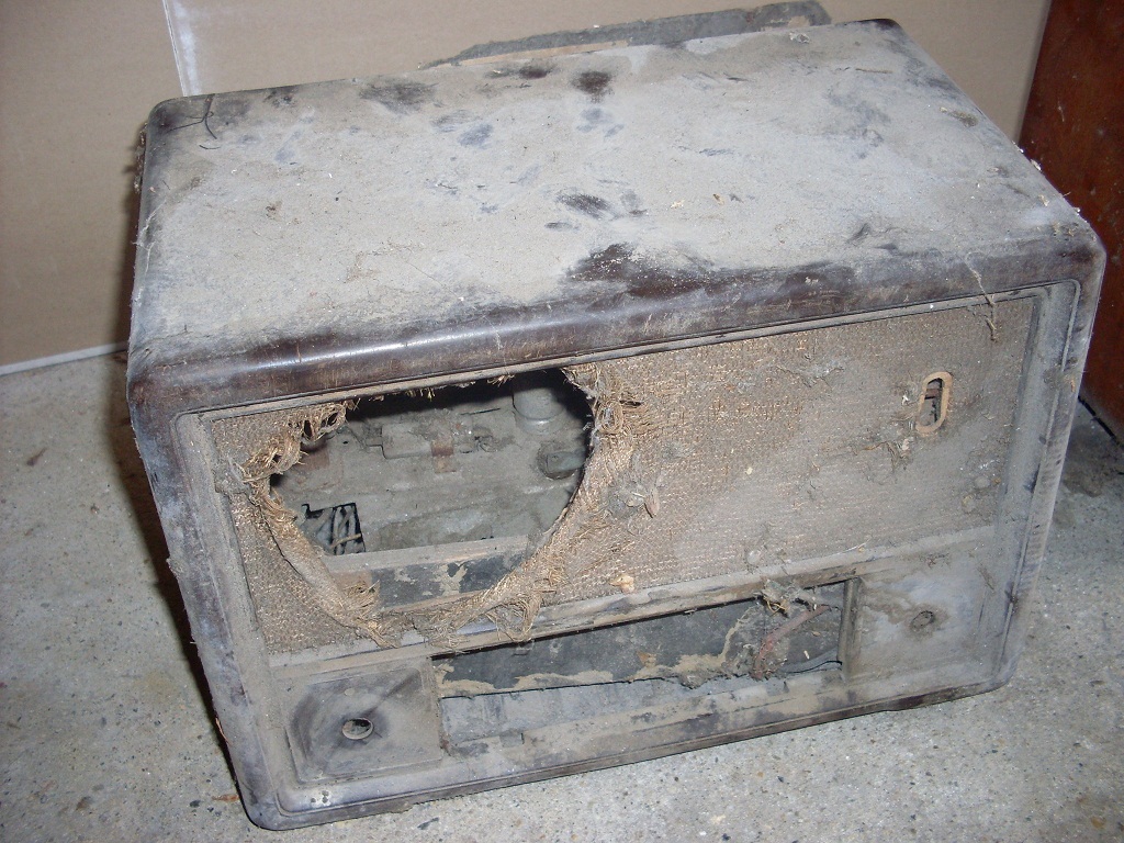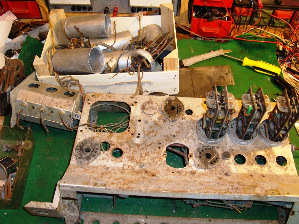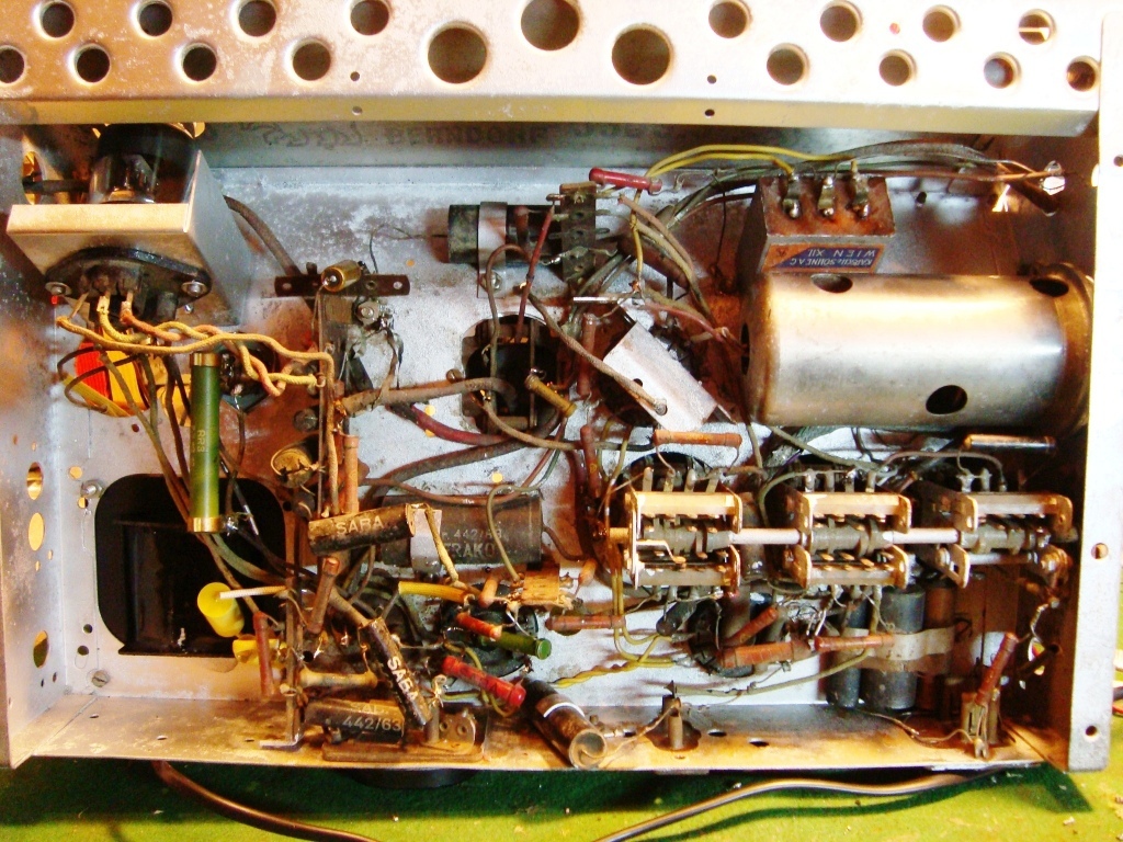 Üdv mindenkinek. Megint hozzám került egy szörnyűség. Koszos, rozsdás, egérrágta, és hiányos. Ez egy egy 1949-es gyártású SABA 457-es . Hiányzik a hál. trafó, a skála, az összes cső, hangszóró a kitrafóval, stb. Szerencsére az eredeti képei meg van a Rádiómúseum-ban, illetve találtam rajzot a neten, egy lengyel gyűjtő jóvoltából. Fel kell újítani, így először kipucoltam, lebontottam amiket lehetett és kimaszkoltam a festéshez.