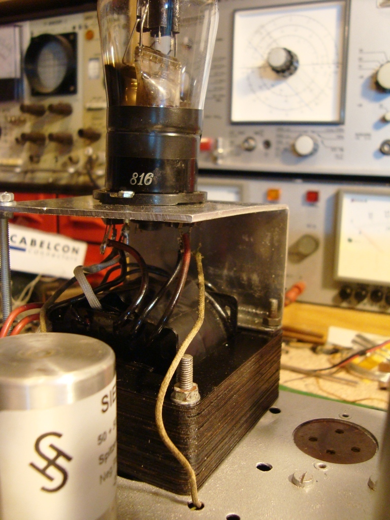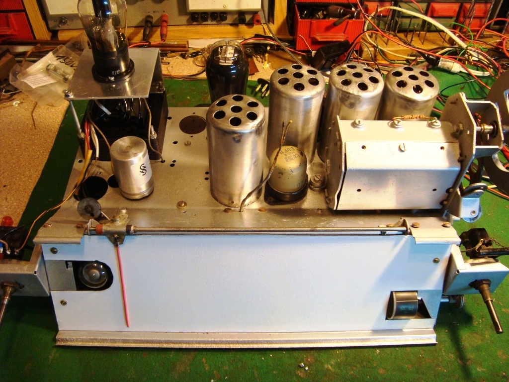 Készült rá az eredeti formához hasonló egyencső tartó lemez is, be is kötöttem, működik szépen. Sajnos az egész gépet még nem tudom áram alá helyezni, mert a csöveket csak a fénykép kedvéért raktam bele, vagy rosszak, vagy nem bele valók. Hogy a Német észjárásból is mutassak valamit, a hangszin pot. méterre van kötve ez a csukló rendszer, és mechanikusan változtatja az első KF sávszélességét, egy benne forgó tekercsel. A forgót hajtó skála-rendszer is valami körhagyó csuklóval működik, de hogy hogyan, arra még nem jöttem rá. Most vadászok a csövekre, addig pihen a rádió.