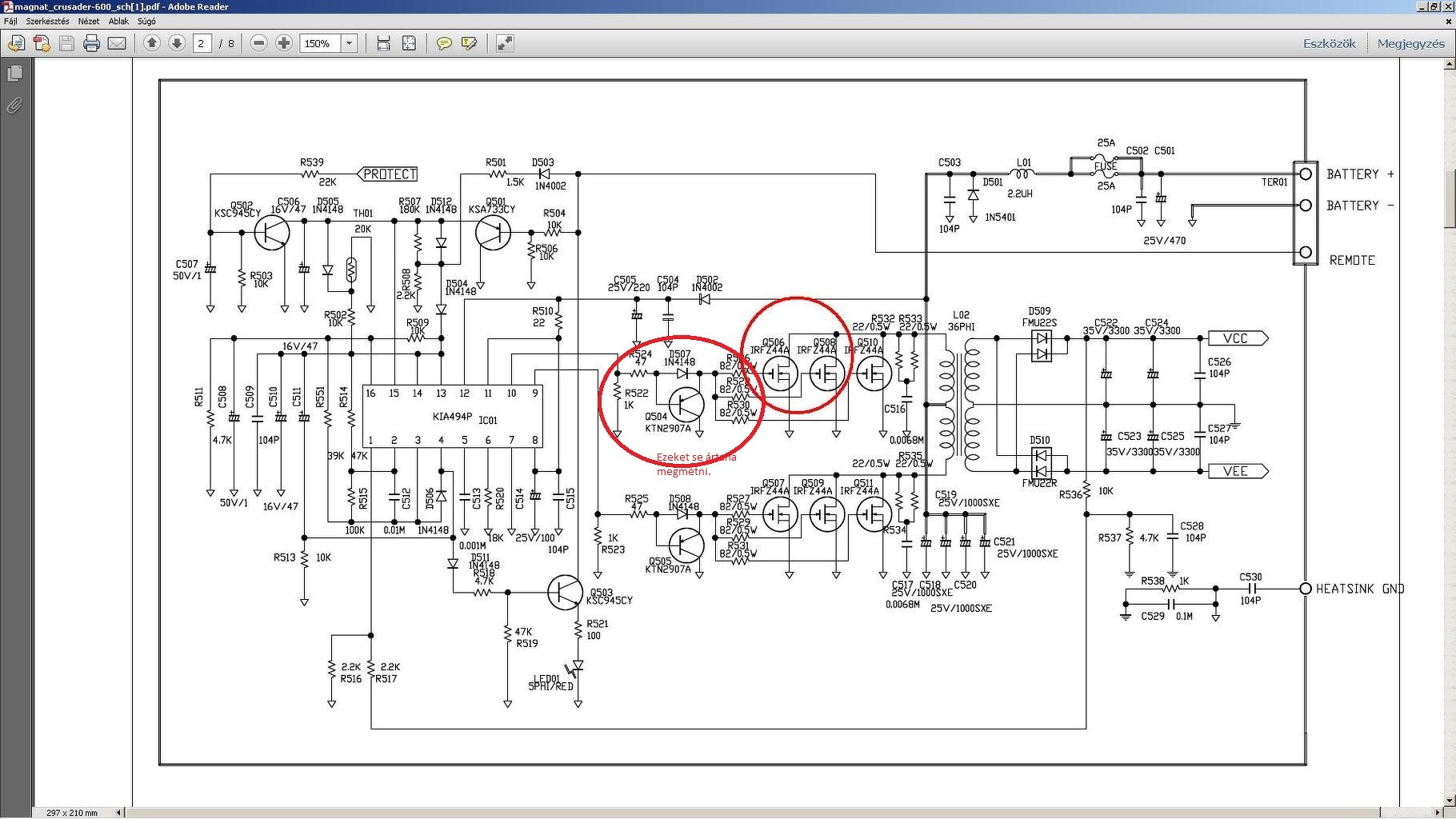 Már sokadik alkalommal javítom egy barátom erősítőjét (Magnat Crusader 600), mindig ugyanazzal a hibával kerül vissza hozzám. Igazából nem tudom mi történt vele, mert kb.: 4-5 éven keresztül semmi baja nem volt majd egyszer zárlatos lett. Az erősítőben lévő inverter (remélem jól nevezem) egyik FET-je zárlatba ment (Q508 pozíció szám). Kicseréltem hasonló FET-re (irfz47-re), ilyenem volt. Mintegy fél évig tökéletesen üzemelt rendes kihajtás mellett, mígnem egy bekapcsolás alkalmával ismét csendben maradt. Ugyanaz a FET ment ismét tönkre, gondoltam ez várható volt, mivel némileg eltérnek a paraméterei a többitől. Ekkor vettem egy garnitúrát és kicseréltem mind a hat FET-et egyformára (irfz44n). 2-3 hónap után a Q506 pozíció számú lett zárlatos, cseréltem és azóta még kétszer ment tönkre ugyanaz. Kérdésem az, hogy mi lehet a probléma, illetve mit lehetne tenni, hogy ne szálljanak el a FET-ek Terhelés alatt még sose halt meg, dönget gyönyörűen akár órákon át. Általában akkor pusztul, ha be van kapcsolva (de jelet nem kap) és indítjuk az autót. Egy esetben pedig út közben szolid hallgatás mellett füstöltette el a biztiket. (rajzon piros karika jelzi a problémás helyet) Valakinek ötlete a javításra…? Előre is köszönöm!