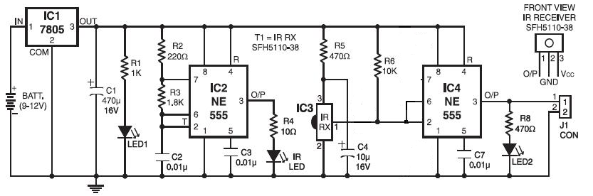 Az adónál fontos a szimmetrikus jel.Ezért tettek a 7 és a 8 láb közé a lehető legkisebb ellenállást. Szkóp nélkül talán matematikailag tudnád a frekvenciát beállítani pontosan.(az 555 astabil képlete segítségével nagyjából jó frekvenciát ( 36 vagy 38 kHz vevőtől függ) kiszámolod majd potméterrel már finoman be lehet állítani. (esetleg egy frekvenciamérő jól jöhet.) Cél az , minél messzebbről lássa az adót a vevő,vagy a minél nagyobb soros ellenállás az adó leddel sorba a biztos érzékeléshez . Ha ez megvan jöhet a visszaverődési teszt. Nem tudom milyen távolságra akarod használni, attól függően változtatni az adóleddel soros ellenállást. Az sem jó ha túl kicsi (messzire lát, bármi visszaverődés már riaszt (ha sikerül akár több métert is tudhat) ha túl nagy, akkor meg semmit nem lát.