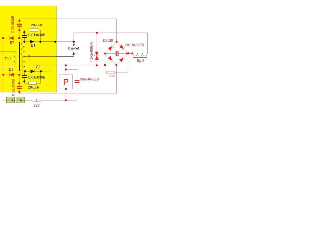 Berajzoltam a rajzomra, pirossal ki vannak emelve a plusz alkatrészek. Tehát kell pluszban 2 kondi, egy graetz, és egy fojtó. A kondik értékét ki kell kísérletezni, valahol 100nF és 300nF (legalább 250V-os MKP4 vagy MKP10 fóliakondi vagy hasonló) között lesz elvileg jó, ezek váltakozóáramú soros ellenállása (Xc) határozza meg, hogy mekkora áram fog folyni a "nagyfesz" körben. Nem tudom mekkora az optimális, valahol 5A és 15A körüli áram elég oda, tehát ennek megfelelően kell megválasztani a diódákat is (mondjuk 15-20A/200V-os gyors diódák). A fojtónak pedig elvileg elég a PC tápból bontott sárga-fehér porvas fojtó. Az 5V-os körben lévő 2db párhuzamos tekercs az áramot bőven elbírja, de a menetszáma szerintem kevés, a 12V-os tekercsé már lehet hogy elég. Szóval olyan és annyi huzal kell oda ami elbírja azt a 10-15A-t, és nem megy telítésbe, pontos értéket nem tudok mondani a hasamra ütve.