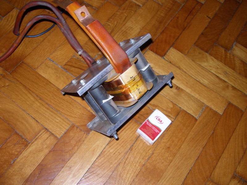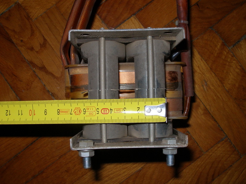 Egy főtrafó a szóban forgó gyűrűvel. Itt még csak a primer van rajta, nem is túl szépen mert kapkodva készült. 100A-al hegesztenek vele.