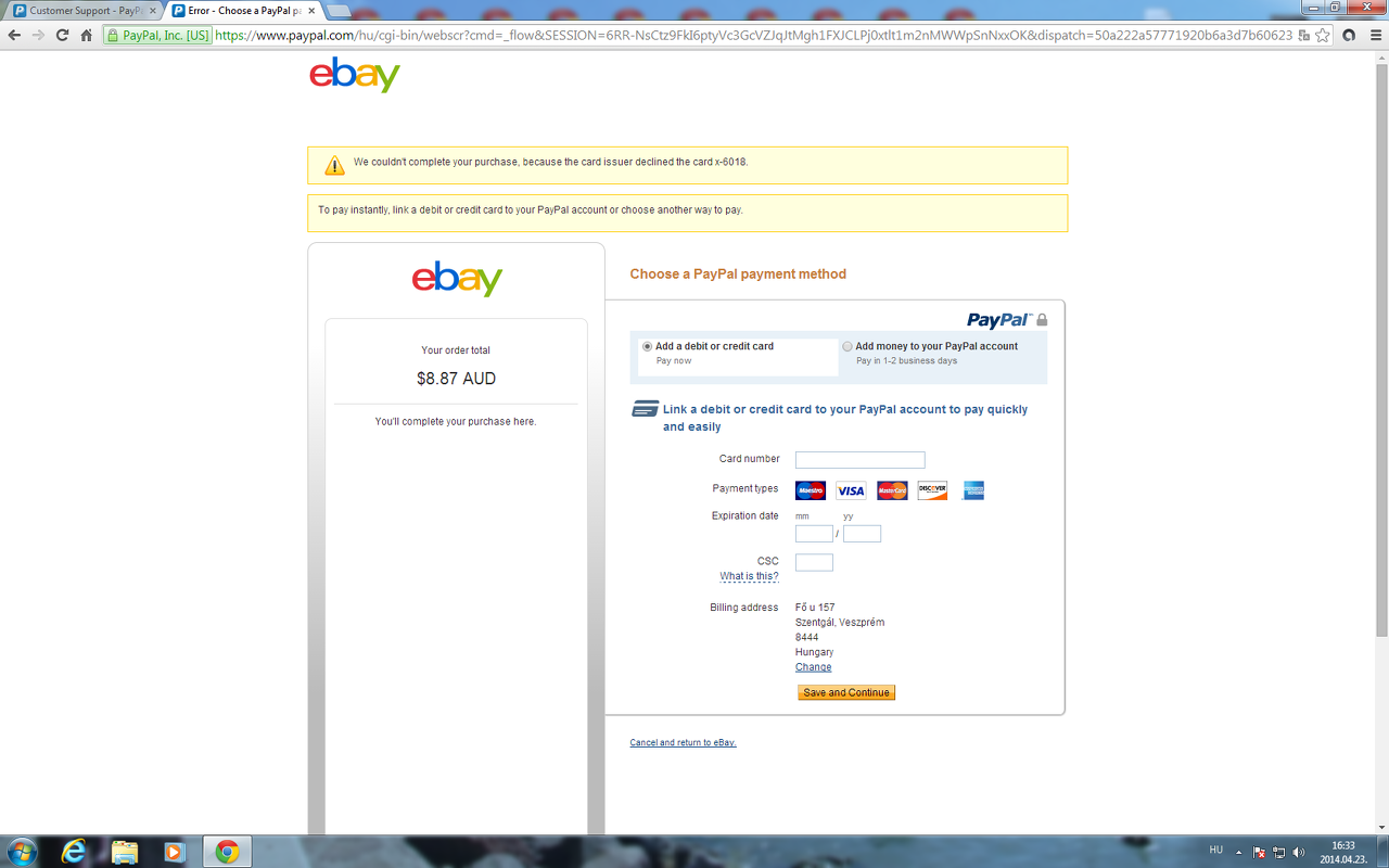 Ezt a hibát írja ki: We couldn't complete your purchase, because the card issuer declined the card x-6018.