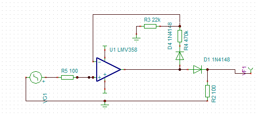 Elgondolkodva a leírt dolgokon az alábbi megoldás jutott eszembe. Így a VF1 kimeneten az üresjárati DC 1mV közeli ami a kivezérlésjelző szempontjából az alsó méréshatár tizede. És bármilyen műveleti erősítőt bele lehet rakni ami kibírja a 100 Ohmos terhelést.