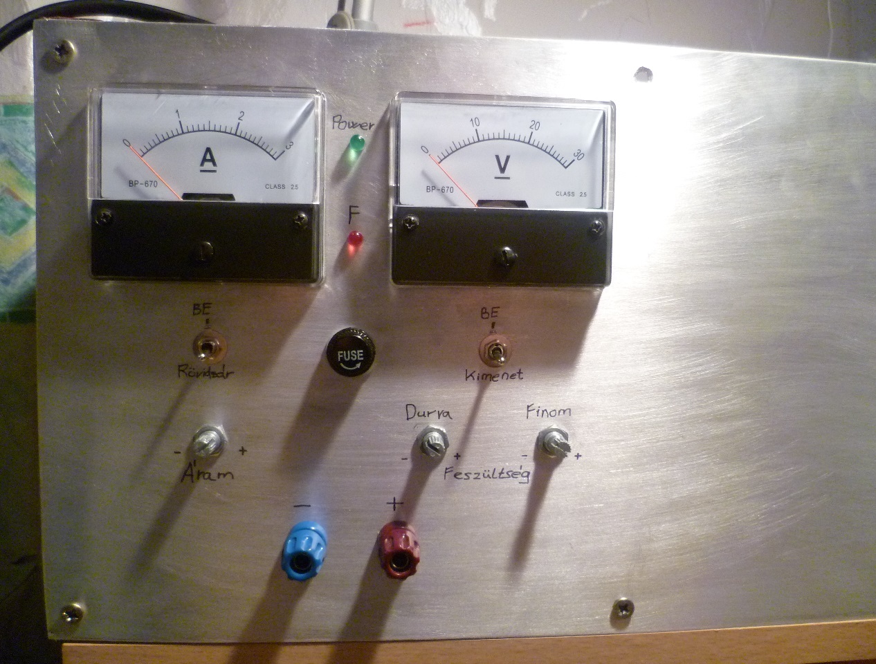 Sziasztok! A héten végeztem a tápegységem bedobozolásával, ennek eredményét szeretném megosztani veletek. Szerintem a lemezmunkálatok egész jól sikerültek, minden furat a helyén, ahogy elképzeltem. A "rövidzár" kapcsolóval az áramkorlát beállítását könnyítem meg, hogy ne kelljen plussz vezetéket használnom, a "kimenet" kapcsolóval pedig a kimenetet kapcsolom, miután megtörtént az értékek beállítása. Az "F" LED a biztosíték kiolvadását jelzi. Próbáltam úgy tervezni mind az elektronikát, mint az előlapot, hogy minnél praktikusabb legyen. A dobozban 2 tápegység lesz, eddig 1 lett beépítve.
