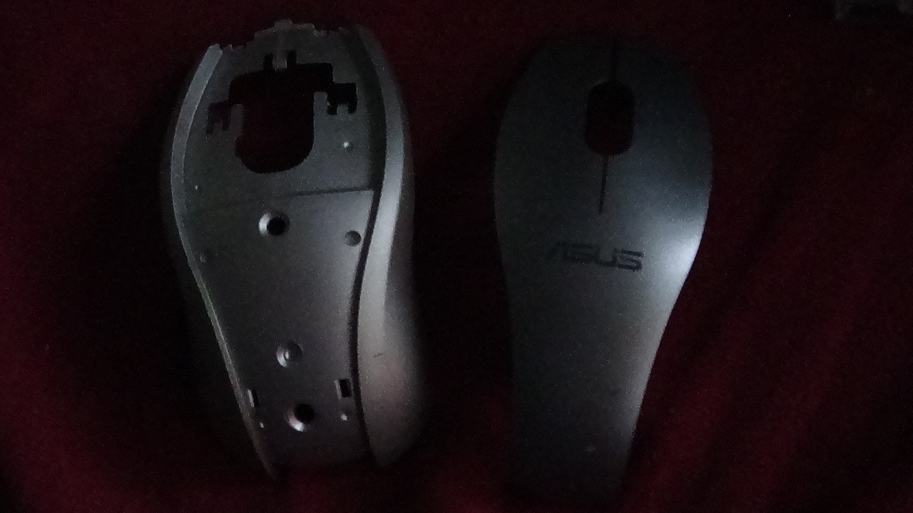 Nevezetesen az egér 2 gomb (bal/jobb) + görgős (kattinthatós, 3. gombként) kialakítású, az áramkörön viszont van egy SW4 és egy SW5 gomb is, amit nem értem, hogy miért tettek oda. A külső műanyag borításon is csak két gomblenyomást szolgáló rugalmas lemezrész van kialakítva, amik az SW1 és az SW2 kapcsolókat érintik, az SW3 a középső gombnak felel meg.