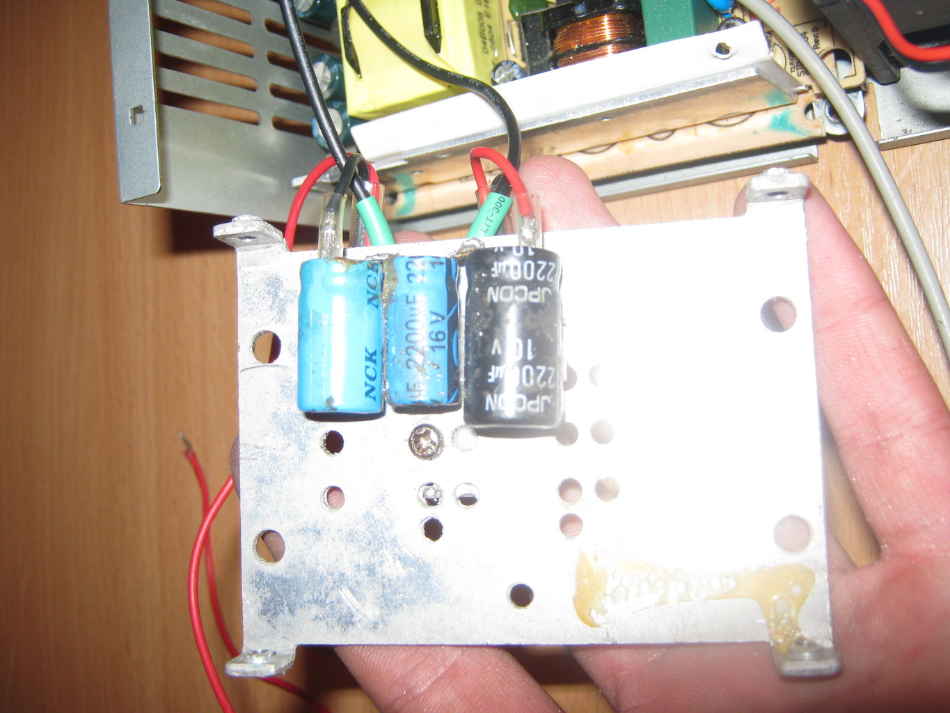 Csak egy tipp. Lehet, hogy csak ragacs az ott a lábának tövénél, de én inkább azt a fekete kondit lecserélném egy jobbra, mintha kifolyt volna, nem látni rendesen a képen.