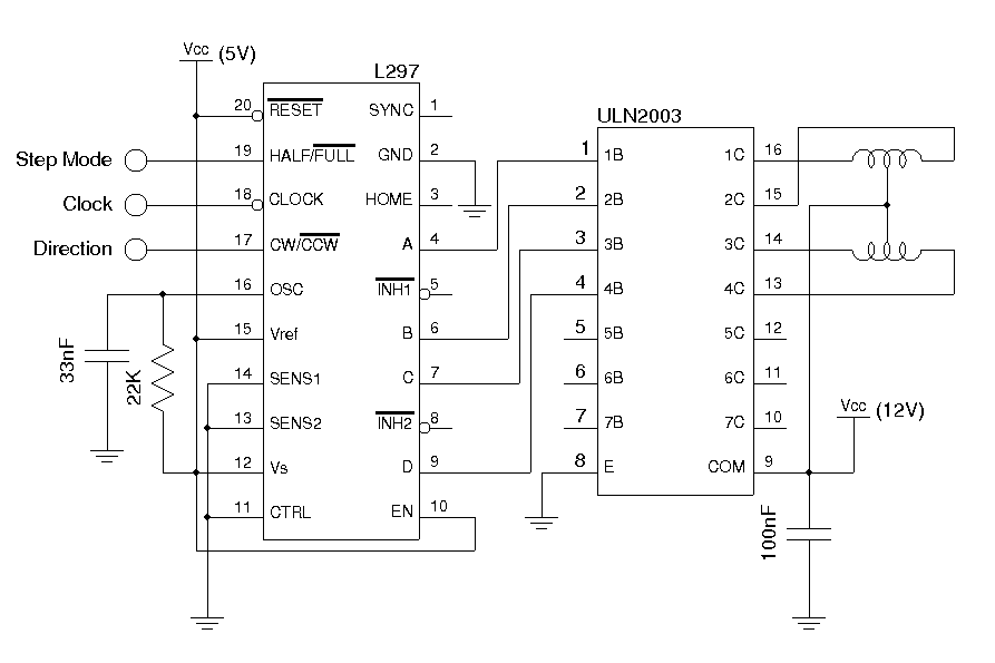 A legegyszerűbb, ha fogsz egy L297 ütemvezérlő IC-t, két lábát (például A,C, vagy B,D) kötöd a két fázis lábra, és mint írtam, a két áram beállító lábra potit raksz. (Ennél jóval olcsóbb, ha megépíted ezen a képen látható kis áramkört, ez ugyanezt csinálja, itt is az első és harmadik kimenet kell.) Ez nem oldja meg viszont, hogy amikor épp tartósan nem mozog a motor, akkor ne melegedjen a motor, ilyenkor el kellene venni az áramvezérlésből (tartóáram) . Egy mikrovezérlővel ezt szépen meg lehet oldani. Nem tudjuk mihez értesz, és mennyire. Nem tudjuk hogy az IC-ket magában (pl. a referencia kapcsolást utánépítve), vagy az eredeti panelt felhasználva akarod használni. Egyáltalán mit akarsz mozgatni a motorral.