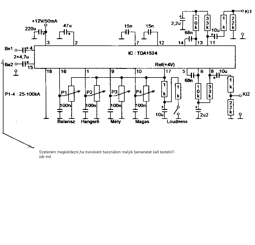 http://www.schematics.wz.cz/schemata-korekcni_predzesilovac_TDA1524.html Erről van szó 15volt-os tápfeszről próbáltam , hát nem tetszik , azon felül hogy csak az egyik fele szól (ez lehet az előző nyák próbálgatásától ) nagyon zajos , a basszust szinte csak fél állásig lehet feltekerni mert onnantól annyira torzít hogy az nem igaz , a magas és a balansz talán a két dolog az egészen ami rendesen működik , azon gondolkodom hogy érdemes e egyáltalán venni bele új íc-t hogy szóljon mind két oldal , mert hát elég siralmasa hangja :S. Érdemes lemenni 10v-os tápfeszre ? mert olvastam hogy a felett nagyon zajos A TDA2003as végfokom magában szebb hangot produkál
