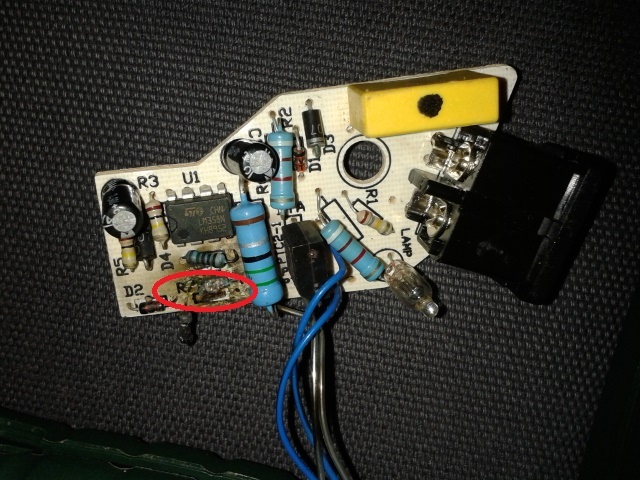 A másik oldalt nem látom, de gyanítom, hogy a sárga kondi egy 220nF körüli X2-es típus és ez a tápegysége a 358-as műv.erősítövel felépített szabályzónak. A kék vezetékkel keresztezett fekete kocka pedig a triac, ami a 230V-os fűtést kapcsolgatja. Mivel ennyire porig égett, feltehetőleg a triac beadta a 230-at a kisfesz oldalra, így az IC-nek is annyi... Nem nagy meló, kicsit rajzolni kell és abból kiderül.