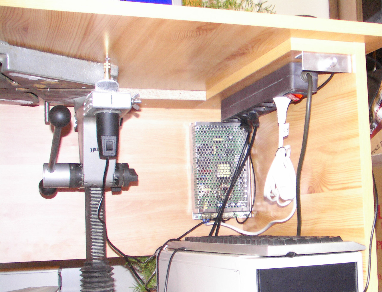 Az alapja egy bútorlapból méretre készült asztal, aminek az asztallapjára alulról felcsavaroztam egy fúró állvány. Az állvány egy mini drillt tart, amibe a 3,2-es befogószárú karbid fúrókat lehet befogatni. A fúrószár felett az asztallapban van egy 6mm átmérőjű furat, ezen keresztül tud a fúró alulról felfelé fúrni. A fúró felett kb. 30mm magasan van egy pozícionálható USB mikroszkóp, ami kivetíti a panel részletet és a furatot egy LCD kijelzőre. A kalibrálás úgy történik, hogy egy semleges területen (technológiai kereten) készítek egy furatot, majd az elkészült furatra rápozícionálom a mikroszkóp szálkeresztjét. A fúrás innen már egyszerű és gyors. Csak a szálkereszthez kell igazítani a nyáklemezen lévő forrszemek közepét és indulhat a fúrás. A mini drill 12V-os. A fordulatszám szabályozást egy kapcsoló üzemű táp feszültség szabályozó trimmerének potenciométerre cserélésével oldottam meg. Képek: