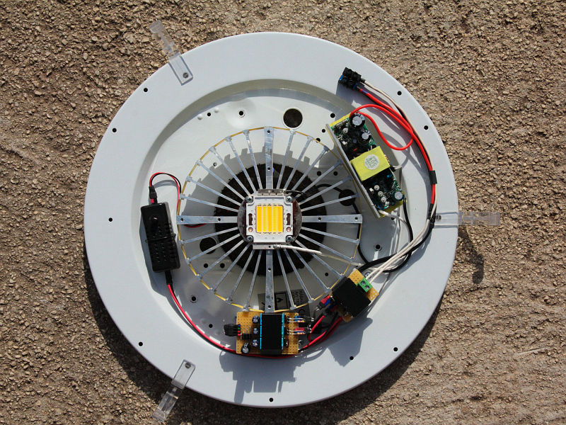 Én 40cm-es ufólámpába tettem 50W-os power ledet, a plafon és a lámpa fém burkolata között hagytam 1,5cm hézagot, ott szívja be a levegőt a venti. Elhanyagolható hangja van, szabályozható a fordulatszáma, távirányítóval változtatható a fényerő, és le is kapcsolható a kényelem kedvéért 30cm ufólámpába 30W-os ledet raktam. Szinte már az egész lakás power ledes, sokat lehet vele spórolni, idővel behozza az árát.
