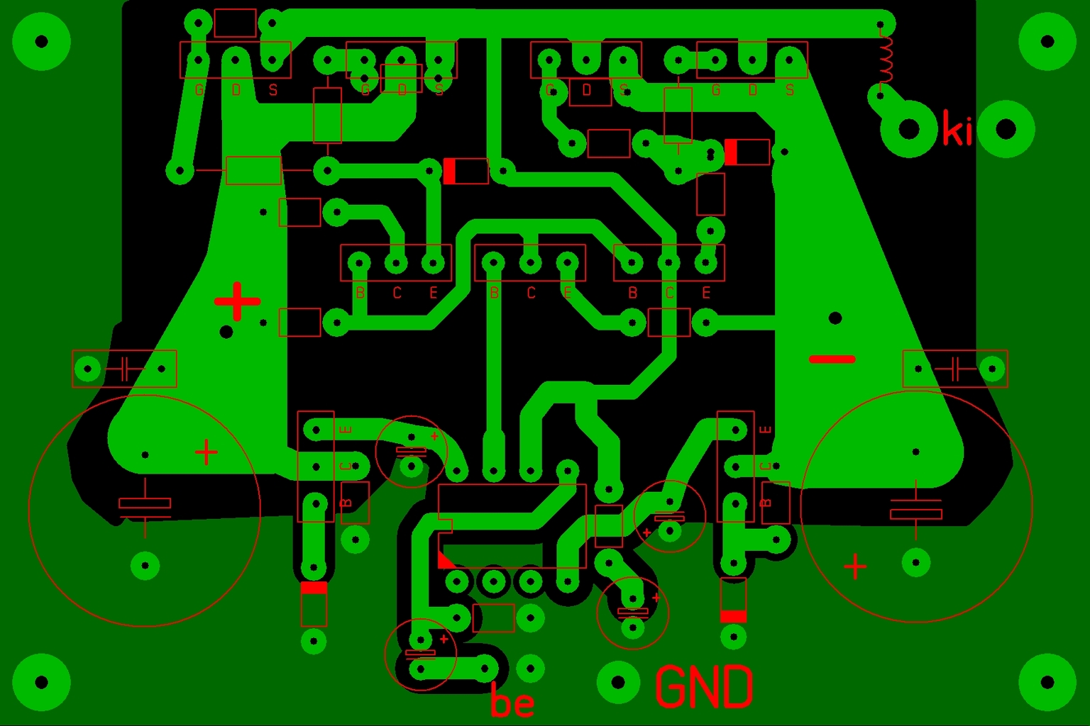 Tudom, hogy itt a megépített munkát kéne felraknom. Most végeztem egy fetes erősítő tervezésével. Szinte csak táptól függő, fetnek bírnia kell a feszt meg áramot. A tranzisztor nem kap nagy áramot szóval szinte csak feszültséget kell bírnia, 50Vról 50mA max. Harmincegyszereset erősít. Max teljesítmény 50Vról : 1%-os torzítás mellett 230W 4ohmon, 10% ~300W. A torzítás a felső feten nincs, de az alsón mint ha elfogyna a táp, levágja az alsó szinusz tetejét (közel 5%-os torzítás körül kezdi levágni). Két vagy négy azonos fetet kell használni (N csatornás), így ugyan olyan jó lesz pozitív szinusz és negatív szinusznál, hiába melegszik, mindkettő együtt változik.