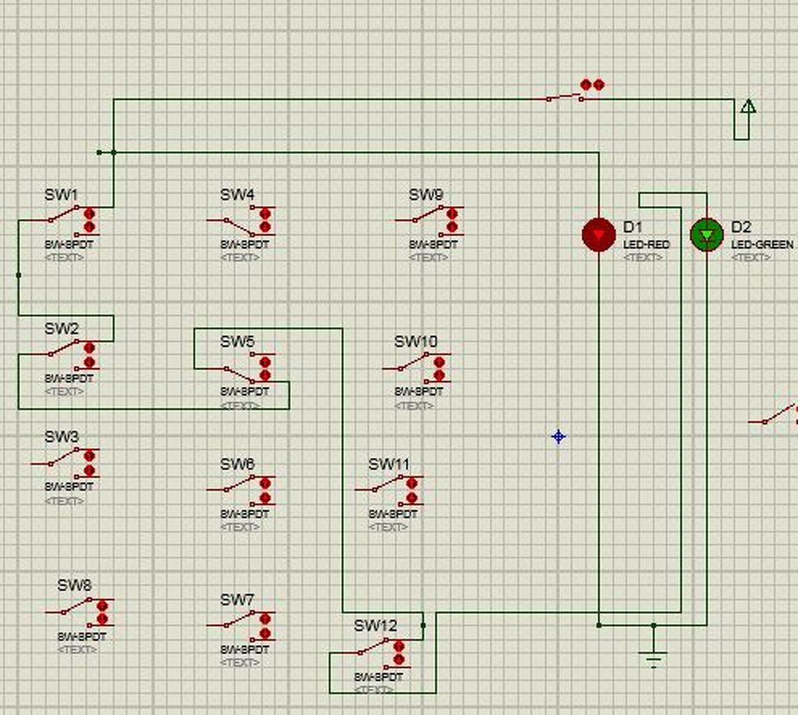 Na szóval. Az én dobozom három feladványból áll. Mindegyik feladvány egy pár sorba kötött kapcsolóból áll. Így csak a megfelelő kapcsolóállás esetén folyik át rajta az áram. Ha jól állítják be a kapcsolókat, akkor egy kis zöld színű led kigyullad. A led melletti ellenállás csak azért szerepel, hogy a lednek ne legyen túl sok a laposelem. Ezzel párhuzamosan a mágneskapcsoló meghúz, azaz zárja a fenti/lenti érintkezőket az ábrán. A zárnyitást az elektromágnes intézi, amelyet (azért, hogy ez elem le ne merüljön hamar bekapcsolva felejtett esetben) egy nyomógomb működtet. Tehát nyilván csak akkor jut el az áram az elektromágneshez, ha mind a három rejtvény meg van oldva, és a nyomógomb is be van nyomva.