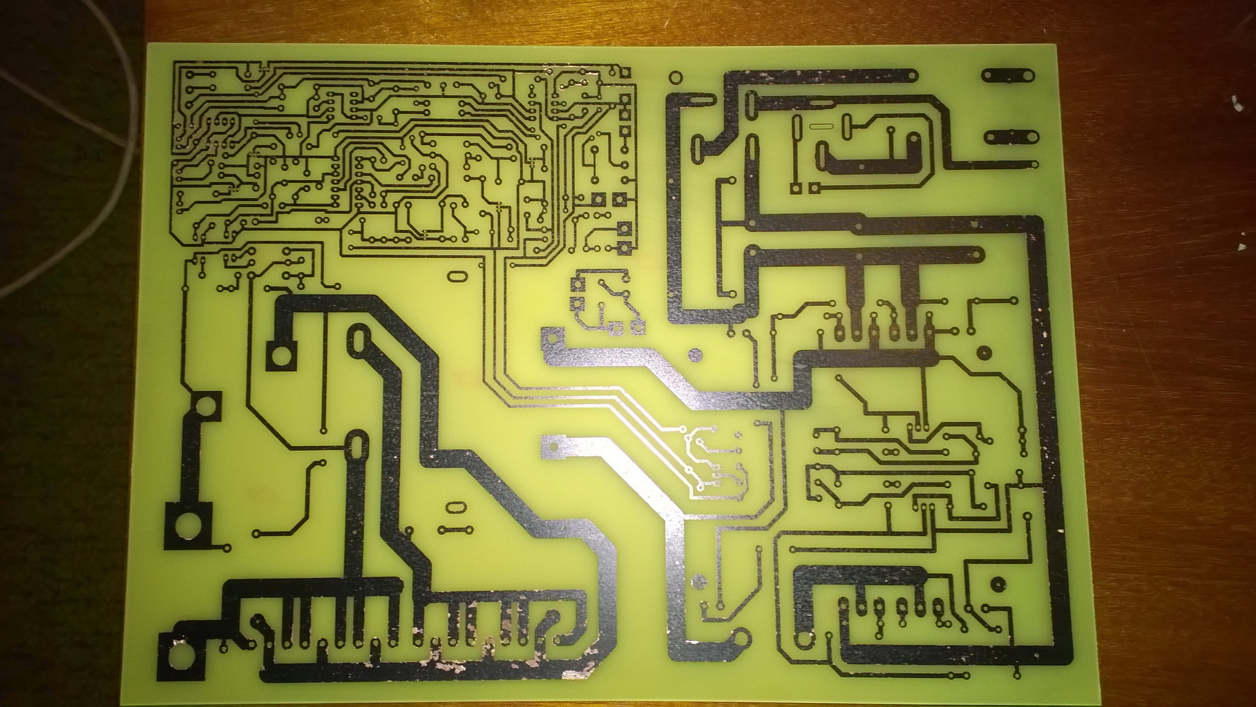Szia! A nagy áramú részeknél igyekeztem 10mm kúszóutat kialakítani. Mikor kész lesz, majd lakkozom az egészet. Az egész panel ónozásra kerül merítéssel, és a nagy áramú részekre szereztem 5x1,5mm rézszalagot (önindító bontások