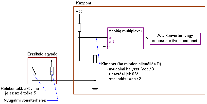 A központ lehet egyszerű és bonyolult is, az egyszerű: Olyan, öntartó relé, ami a Reed jelére húz meg, és egy "reset" gomb megnyomásáig megtart. Bonyolultabb: Akár a csillagos ég...