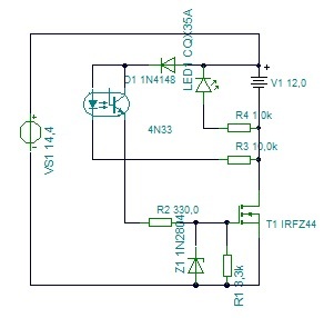 Hello! Igazából az optocsatoló szükségtelen. Ugyan ezt az eredményt kapod, egy PNP tranyóval, ha bázis-emitterét a Led-re, kollektorát az R2-re kötöd. üdv!
