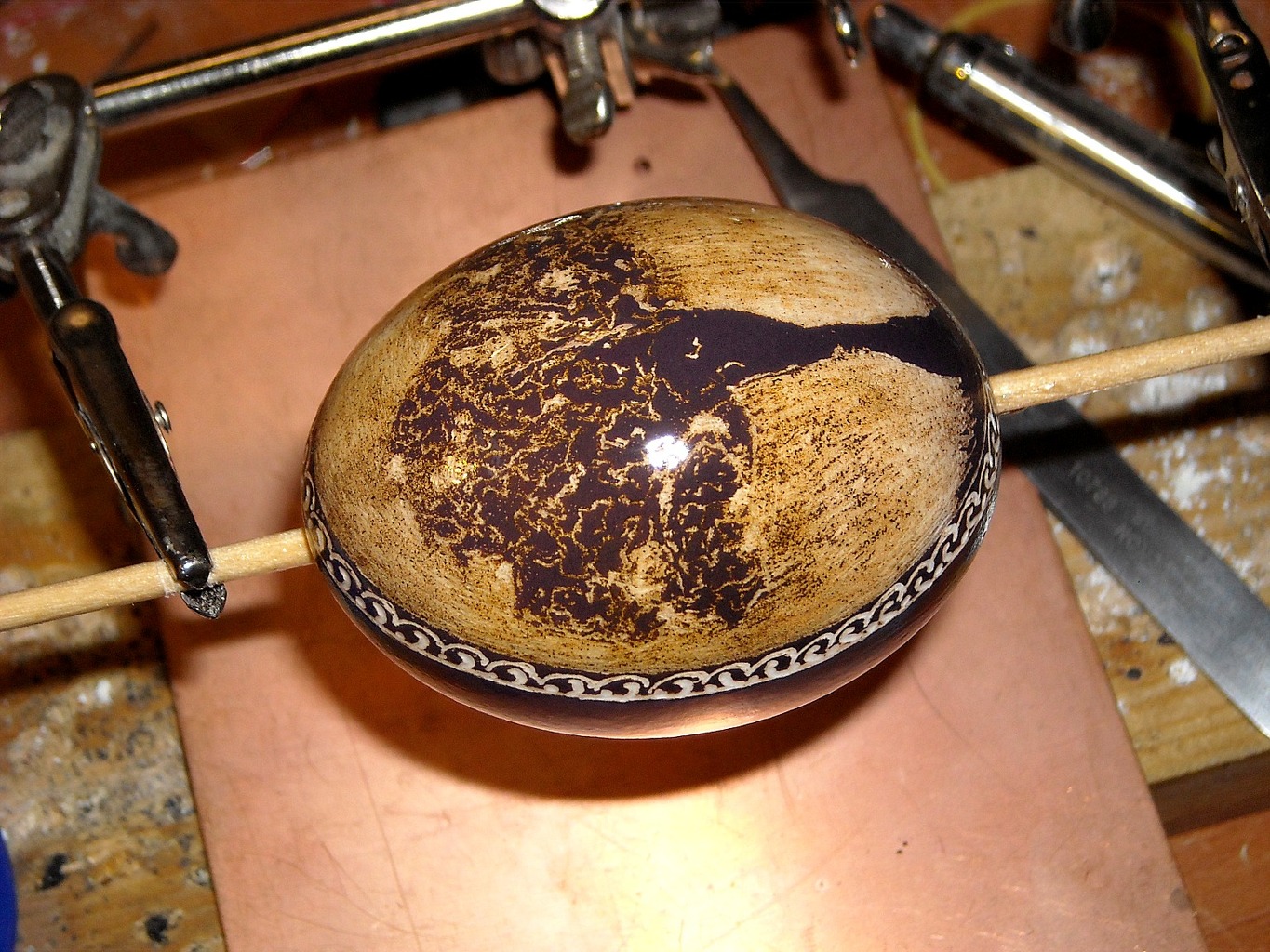 Nyakunkon a húsvét. Úgy döntöttem, kipróbálom a kaparásos tojásminta technikát. Az áldozat egy szimpla tyúktojás kifújva, majd nagyon sötét bíborra festve. Ezután 3 óra kaparászás és kész is lett. Most szárad a lakkozás.