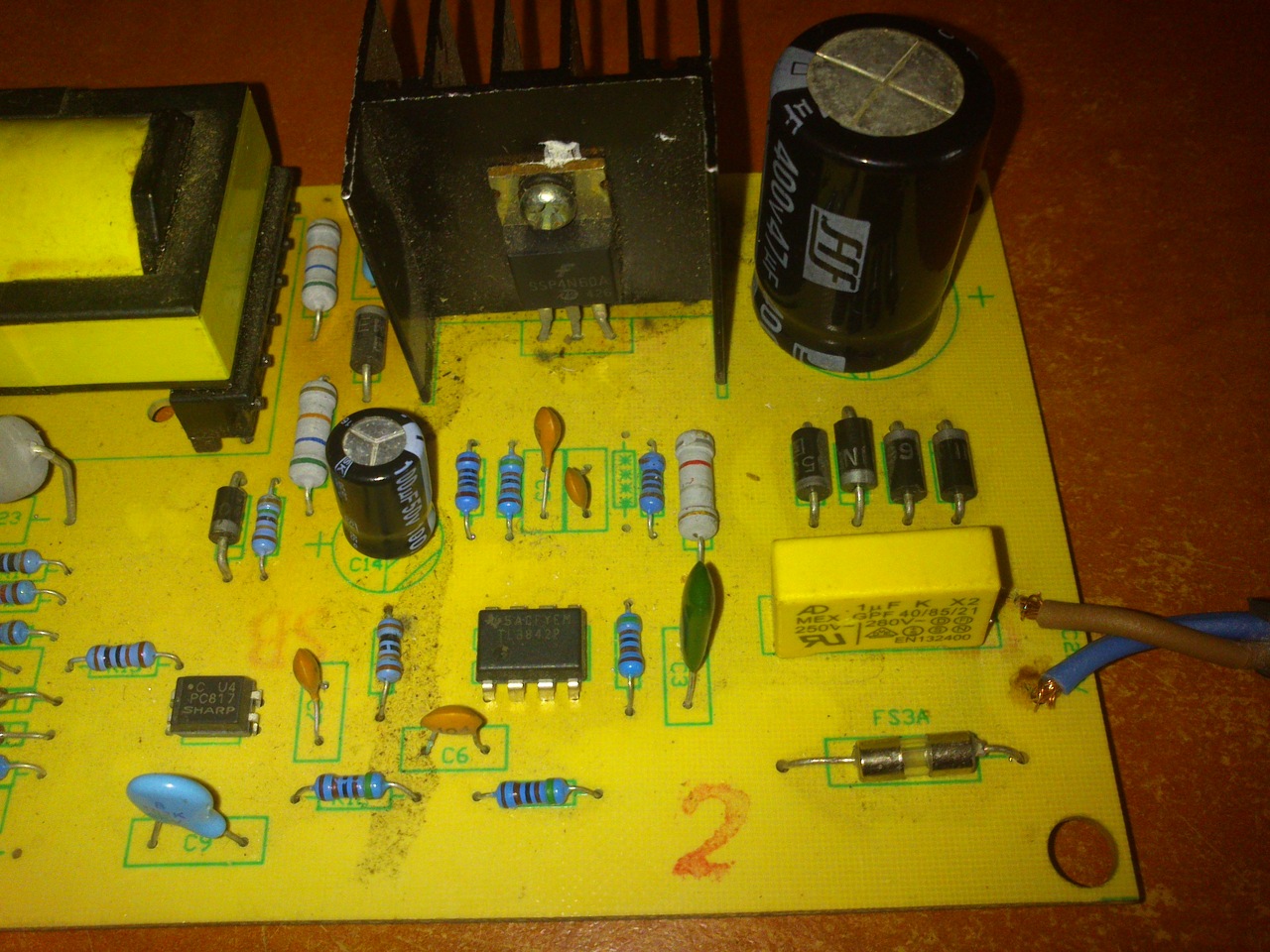 Először cseréld ki a 47u 400V és a 100u 50V-os kondikat a primer oldalon. A 3842-es ic 7-es lábán 15 volt körüli feszültség kell legyen, ha nincs akkor a 100 Kohmos ellenállás szakadt, vagy ha ugrál a feszültség 10..15 volt között cseréld ki a vezérlő ic-t. Mérd ki az összes ellenállást a primer oldalon. A szekunder oldalon lévő 0,1 ohmos ellenállást is mérd ki.