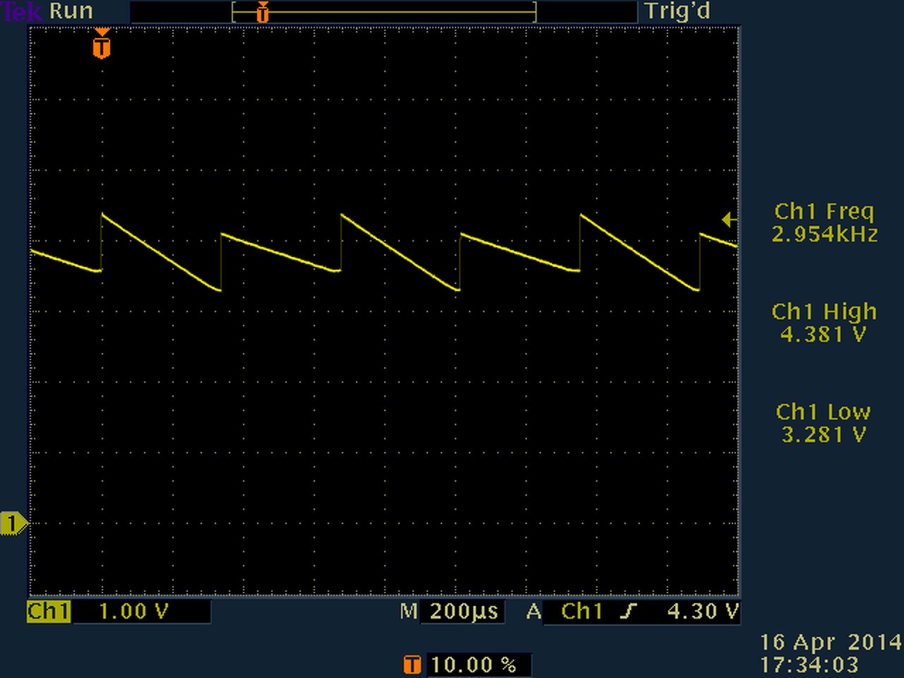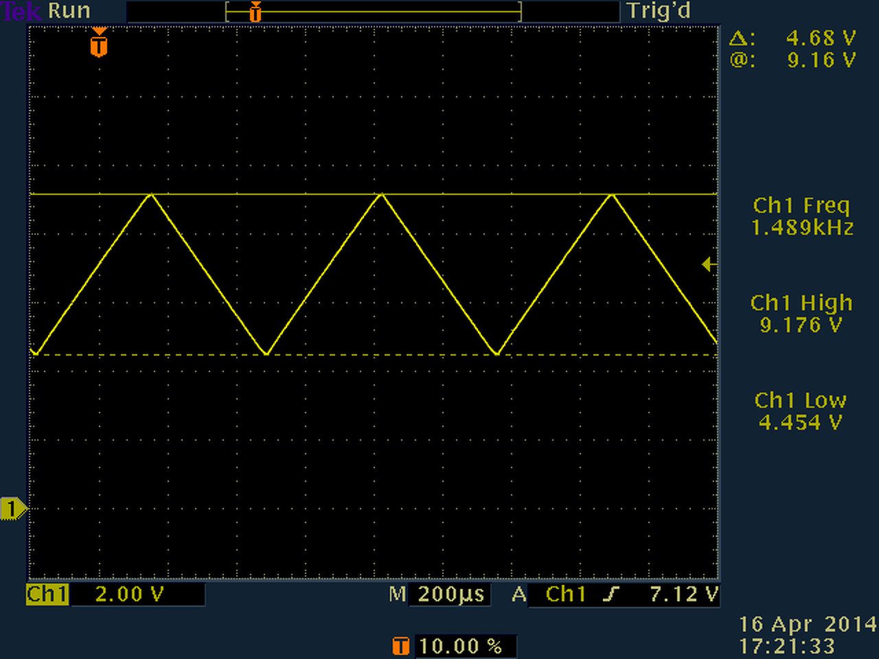 Nagyon köszönöm a segítséget! A 2 lábon (és a kimeneten is) a mellékelt képen látható jel jön ki szinusz és háromszög állásban is. A négyszög nagyon szép a 11 lábon is és a kimeneten is.