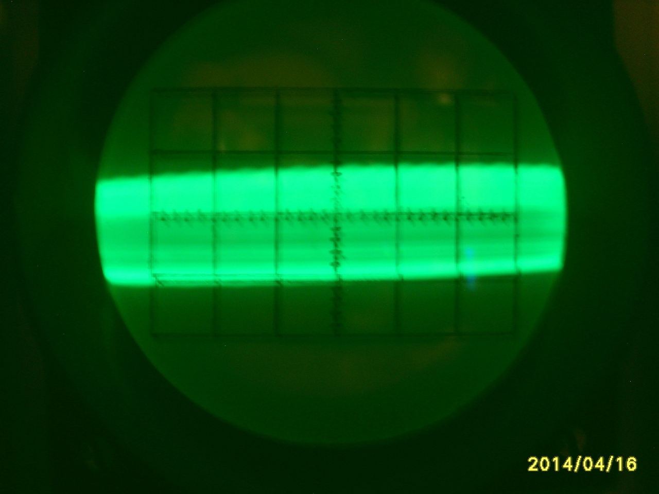 A szkópot 2V/osztás függőleges értékre állítottam be. A színuszhullámot középre állítottam, le is és fel is 1-1 osztás a jel szintje. Az emitteren csak középről felfelé megy a jel, de az is nagyon torzul, az alsó fele a középosztáson egyenesen van két felfelé ívelő hullámforma között.