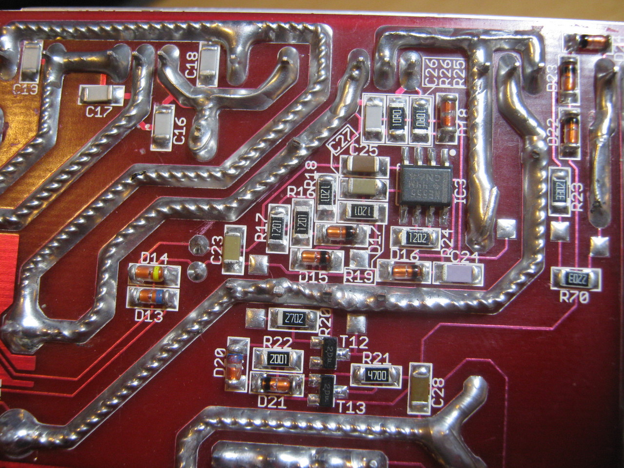 Mint látható nincs semmi gányolás, ónhidat sem találtam. A tápellátást 60v szolgálja, de ezt is fokozatosan kapja mert a trafót egy szabályozható trafóval táplálom, a főbetápot is egy 22R 0,6W-os ellenálláson keresztül kapja, hogy meghibásodáskor ez szálljon el.