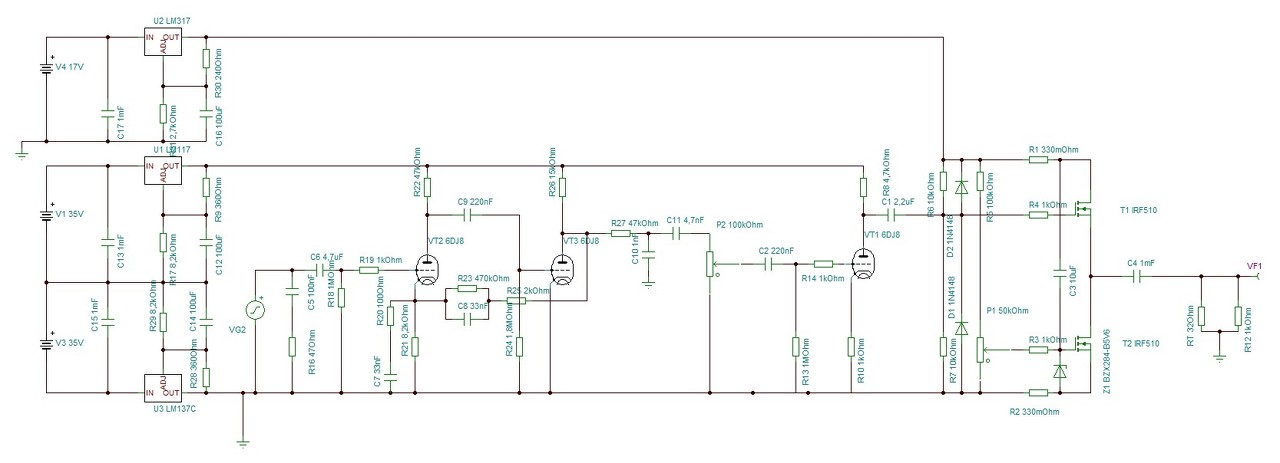 VT1 csövet el is hagyhatod, ha az első fokozat erősítését kb 2x állítod be és visszacsatolását lineárissá alakítanám, elhagynám a mély emelést, így jelentős fázishibát is produkál. Ha mégis meghagyod a VT1 funkcióját, akkor katódkövetőnek kösd be. C2 kondi is felesleges. Csöves rész tápja így nagyon kacifántos, jobban, egyszerűbben is megoldható. A hozzászólás módosítva: Ápr 14, 2014