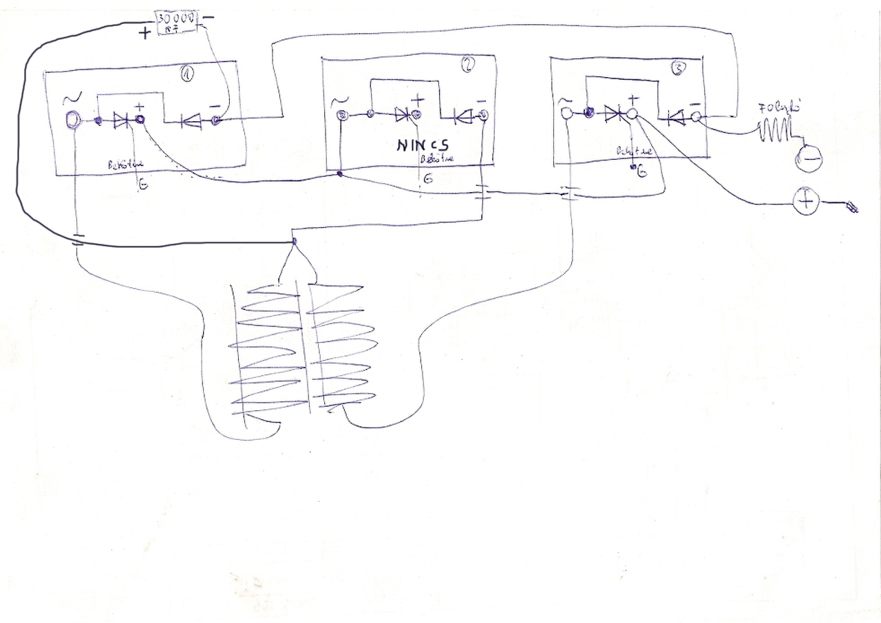 A tirisztorokat nem kapcsolja be semmi,-ha csak nem a tirisztorok K-G elektródái közé van beforrasztott ellenállás. Előfordul, hogy azok az ellenállások, amelyek a szabályzókártyán kellene legyenek, a gyárban kitették a tirisztorokra. Ebben az esetben a tirisztorok mindig nyitva vannak, ha nincs benne a szabályzókártya. Ha a "G" elektródok szabadok, azaz nincs ráforrasztva semmi, akkor nem a tirisztorok vannak nyitva, hanem a pufferkondenzátor pozitív kivezetéséről a diódán keresztül a kondiban tárolt energia tartja fenn az áramot. Ha a pufferkondit lekötöd, akkor a szabályzókártya nélkül nem lehet a kimeneten áram, feltéve hogy a "G" elektródok szabadok.Bár a szabályzókártya rajza már fent volt korábban ,most újból felteszem ide. E szerint a rajz szerint a K-G elektródák közt nincs ellenállás.