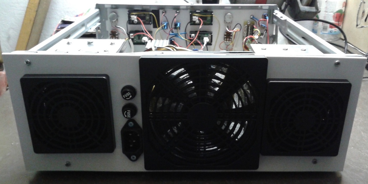 A ventillátorokat az NTC-FAN4 szabályozza. 65 foknál lekapcsolja a tápegységet. De 50 fok főlé nem tudtam hajtani, csak ha a ventilátorok betáplálását megszüntettem.
