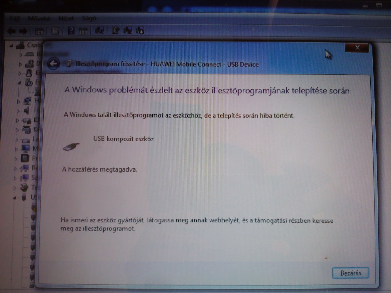 Adott egy laptop Win7-el. Van egy mobil stik Huawei Mobile Broadband E153. Három hónapos a kütyü, működött aztán egyik napról a másikra nem. Vagyis laptop bekapcsol nett sehol.(bármit is csináltál nett sehol). Programja,driverje le lett törölve,aztán újra,bedugva (itt már nem írta ki hogy új hardver,-ez már furcsa volt) annyi hogy az eszközkezelőben ott volt. Ha frissíteni akarjuk a driver-jét talál is a netten de a végén kiírja hogy "ami a képen". Szedtem le hozzá drivert és megpróbáltam úgy,gépen keresztül betallózni neki,ugyan ezt a hibát írja ki a végén. El lett víve a kütyü Szervizbe ott megmutatták hogy jó. Aztán próbáltunk ezen a gépen egy teljesen másfajta sztikket,(másik szolgáltatótól) egyből felismerte és működött is. Remélem mindent leírtam. Szerintetek mi lehet a probléma? Válaszokat előre is köszönöm!