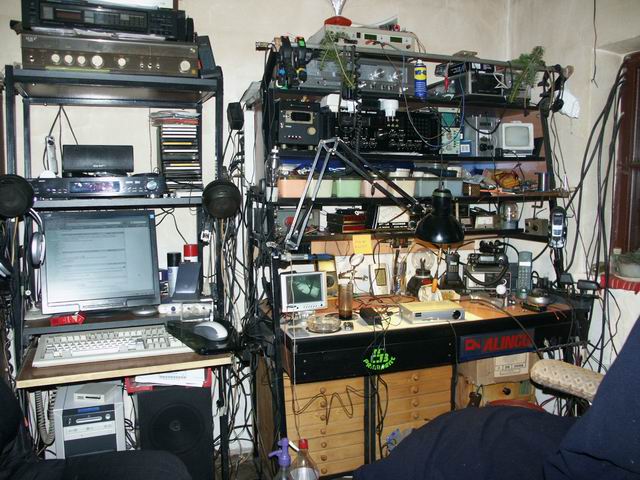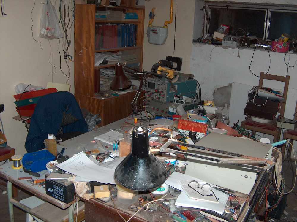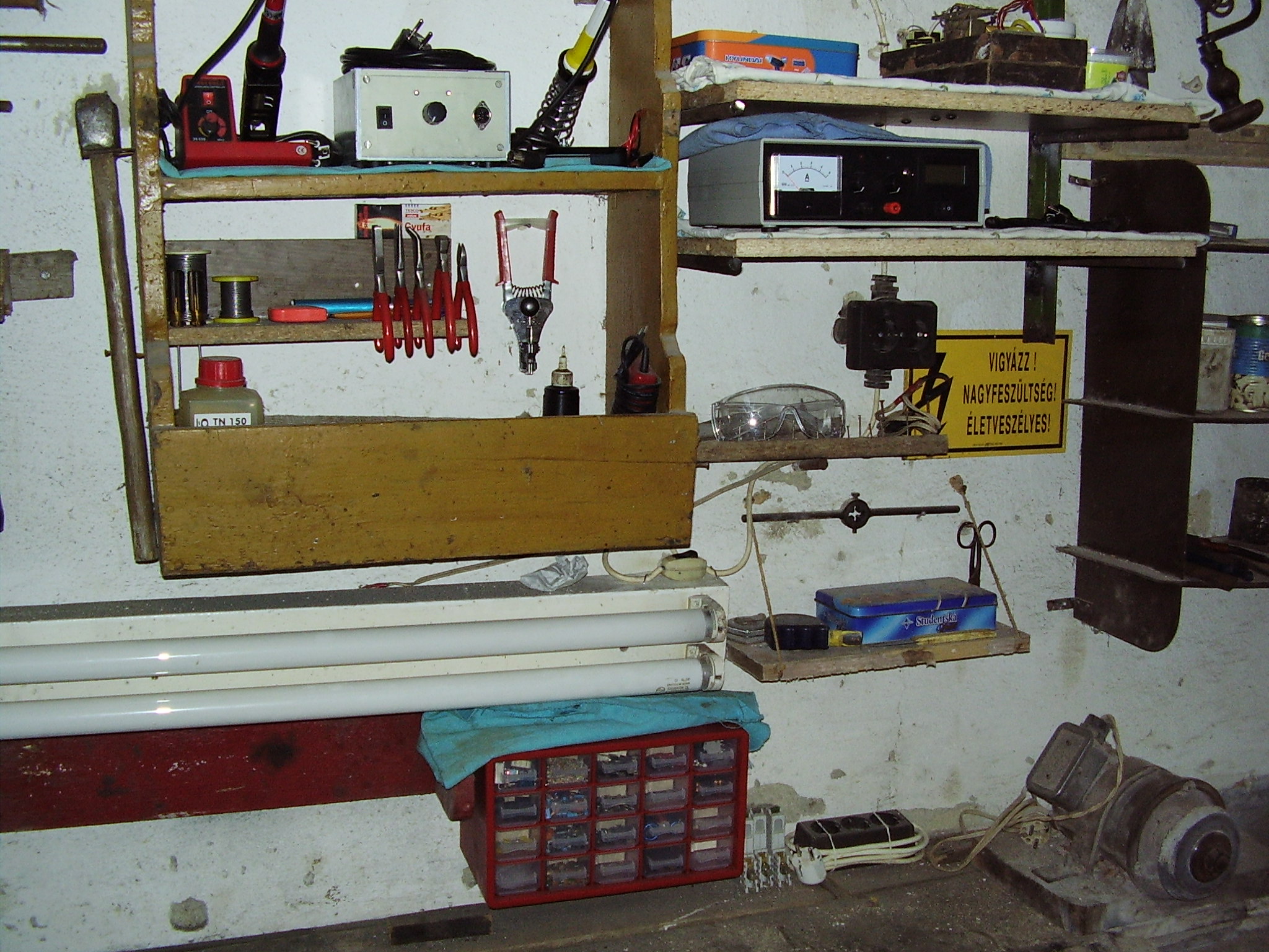 A műhelyem a szobámban van. Így érdekes, amikor a lecsöppent forrasztóón beleég a szőnyegbe .Van még egy P2-es számítógép Mikrovezérlő progizásra a szoba másik felében. Az alkatrésztároló rétegelt lemezből van összeragasztva Ant