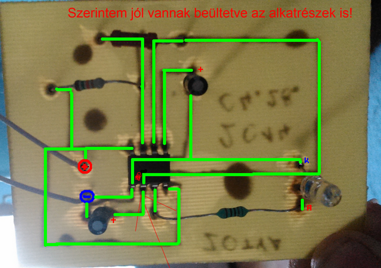 - Egyáltalán nem biztos, hogy a vezetősávok vezetnek is. Mérd meg OHM mérővel, hogy a megfelelő alkatrész lábak között, van-e ellenállás. (Azaz 0ohm..) - Berajzoltam a tápfeszültség polaritását. De nézd meg a kondikat, hogy azoknál is jó-e. (A széles fehér csík a kondi oldalán a negatív lábát mutatja. - Valamint nézd meg, hogy a Led helyesen van-e bekötve. A katód oldalán, a kerek tok le van lapolva. (Vagy ha a lába megvan még, akkor a hosszú az anód.) - Az Ic jól van benne, ha a pötty ott van. Ha még sem működik, akkor mérni kell a táp negatív lábához képest az IC lábain a feszültséget. Abból megtudható, hol a baj. (Hogy sikerült ilyen torz képeket készíteni.. Van 6 kép, és alig látni valamit.) |