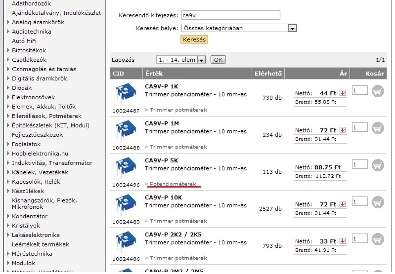 ![]() Keresőbe beírtam, hogy 5k, le okéztam és utána kiválasztottam a keresés helyét: Ellenállások, Potméterek. Azért nem találtad meg, mert nem a Trimmer potméterek között van (sőt, egyik alkategóriában is benne, csak kereséssel található meg). Igen, a kategória kevert be, de nem a te hibádból. A hozzászólás módosítva: Ápr 17, 2014