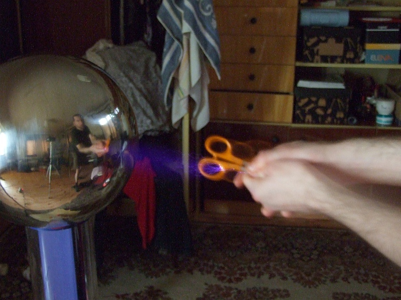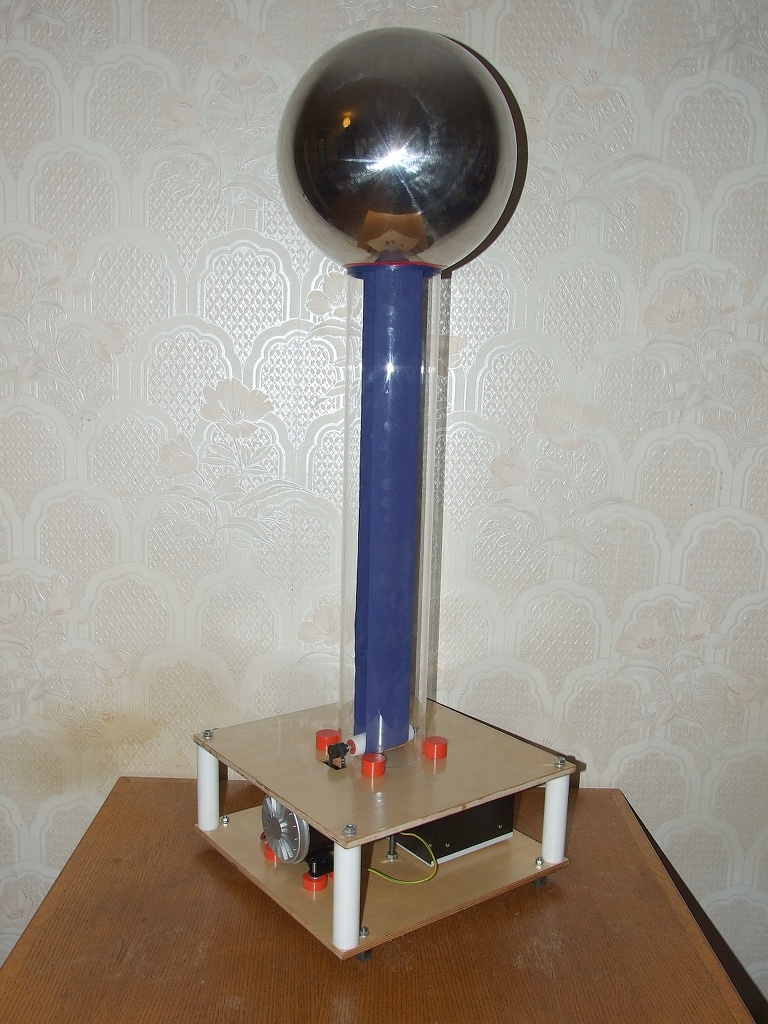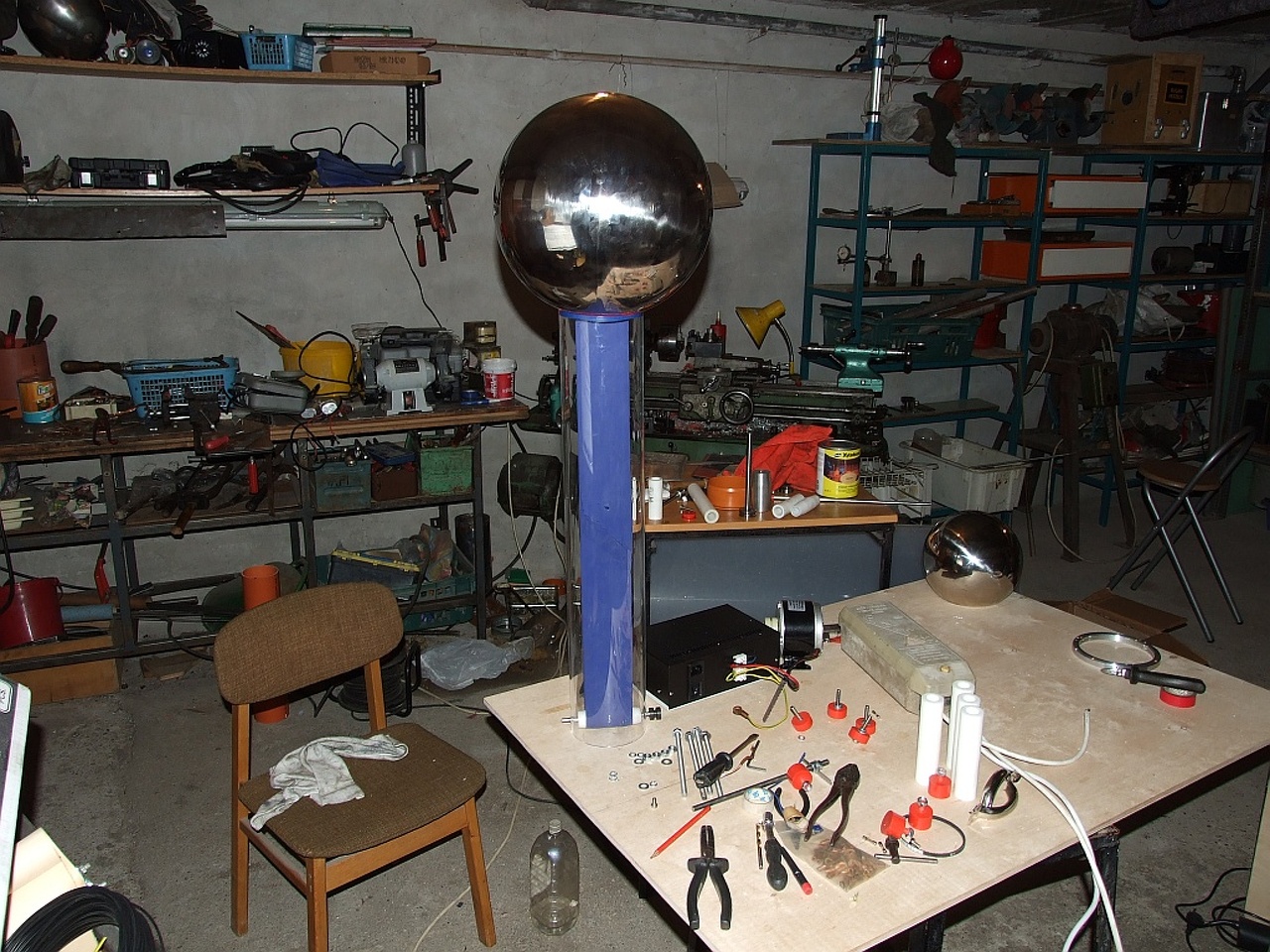 Gömb és környéke. Az állványt lakkozom, úgyhogy még nem tudom teljesen összerakni, viszont simán alsó fésű nélkül megpörgetve a görgőket simán éreztem fél méterről az arcomon a sztatikusságot a gömbtől, és 2 centis szikrák pattogtak a kezemre ha közelítettem hozzá. Nem is rossz ahhoz képest hogy a földelőfésű hiányzik, fincsi lesz alsó fésűvel és motorral hajtva. A lakkozással remélem végzek holnap utánra.