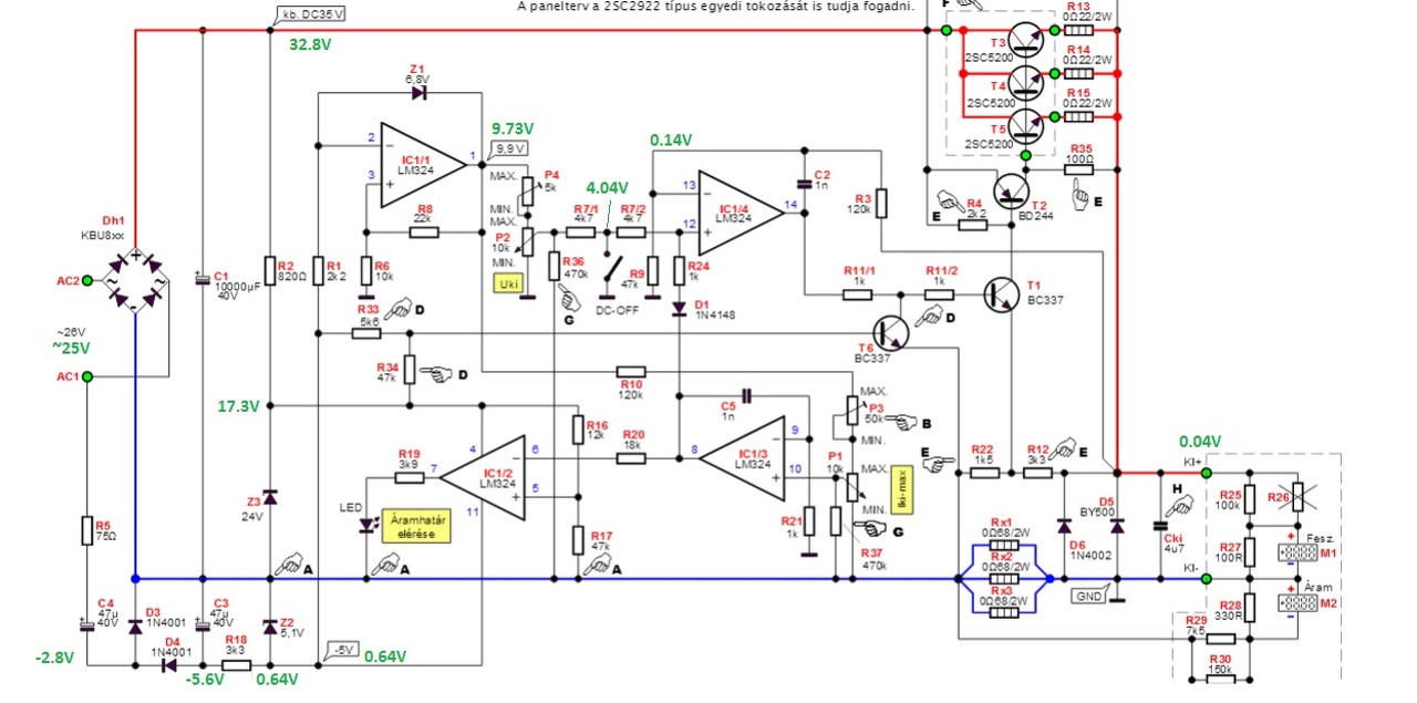Élesztettem a tápot, viszont a kimeneten nincs feszültségem a potik állásától függetlenül 0.04V körüli érték mérhető, áramkorlát ki és bekapcsoláskor felvillan és világít ha teljesen le van tekerve a potmétere. Első körben a kapcsolási rajzon megadott feszültségeket ellenőriztem és már itt hibát találtam nincs meg a -5V a 5.1V zenernél eltűnik. Mellékelem a méréseim eredményeit: