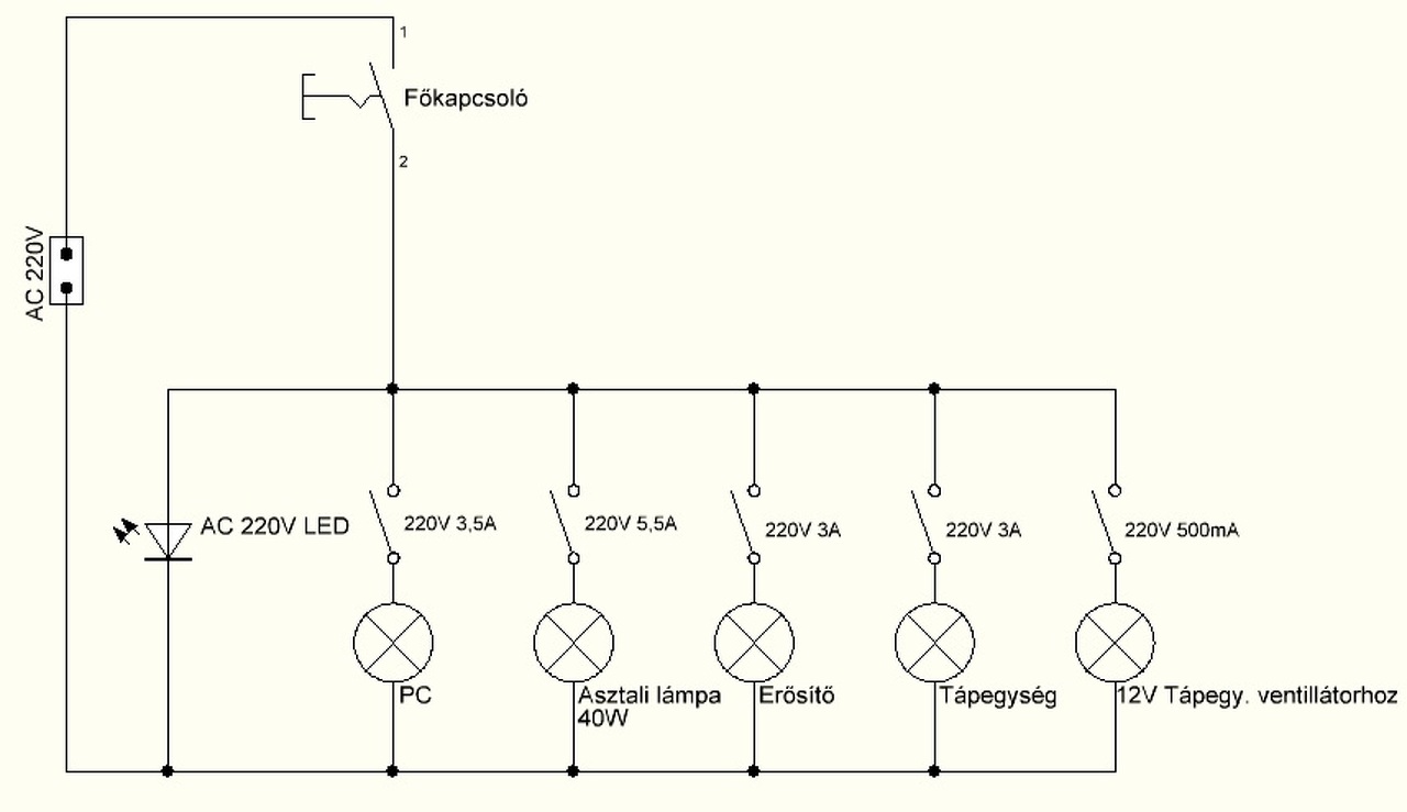 Olyan ötletem lenne, hogy beépítek az asztalomra egy kapcsolós dobozt, 6 kapcsoló lenne rajta, ebből egy főkapcsoló, a másik öttel pedig külön-külön, amelyik eszközre épp szükségem van, azt bekapcsolom. Feltüntettem ezek nevét illetve áramigényeiket, ehhez igazodva választom meg a kapcsolókat is, tehát pl.: asztali lámpámhoz, amely 40W-os izzóval megy, ahhoz egy AC 220V-os 6A-es kapcsolót keresek, mondjuk egy ilyet.. A főkapcsolónak pedig az összes készülék áramigényeinek az összegét kell elbírnia,igaz? Jelen esetben ez 220V 15,5A. Ehhez is találtam egy kapcsolót.