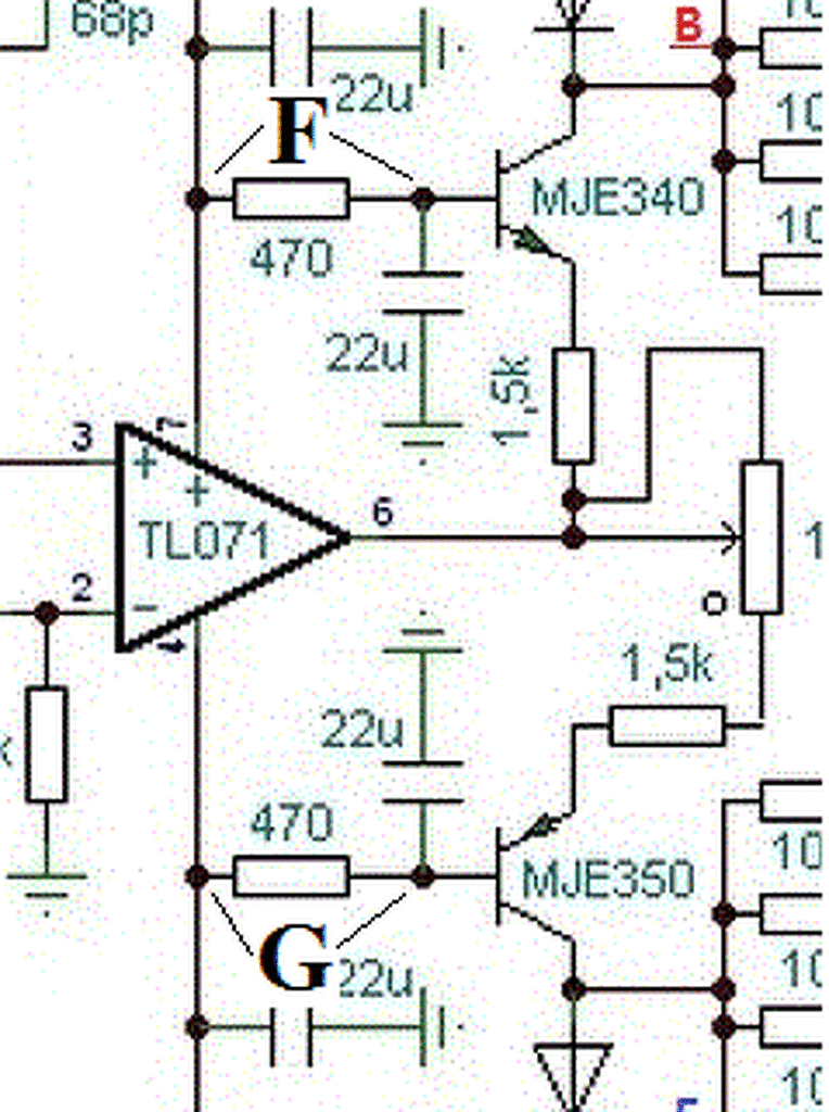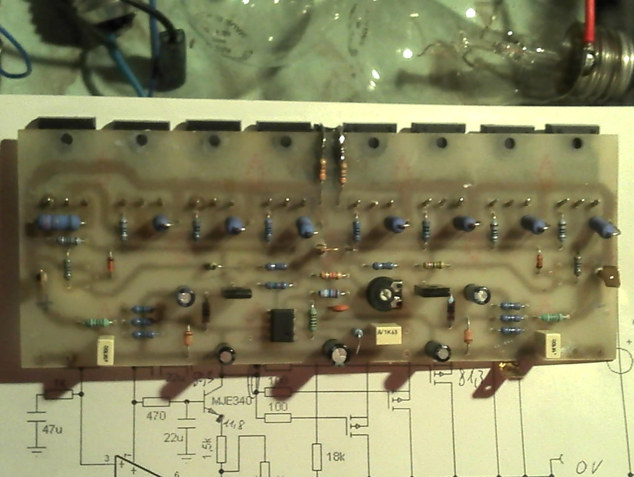Még egy észrevétel: a méréseid azt mutatják, hogy az IC 6-os láb és az MJE340 emitter közötti 1k5 értékűnek jelölt ellenállás a valóságban egy 2k7-es. Rámérnél?