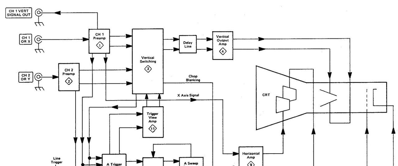 A vertikális erősítő kihúzza a sugarat az ernyőn kívülre, asszimmetriája miatt. Nem csak a "Vertical output board", hanem a vertikális csatorna bemenetétől a végéig okozhat hiba ilyen jelenséget. Mindkét csatornánál van hiba? Ha igen, akkor az elektronkapcsoló után, tehát ahonnan már csak egy csatorna van, onnan a végéig lehet a hiba. Ez esetleg egy multiméterrel is kinyomozható.