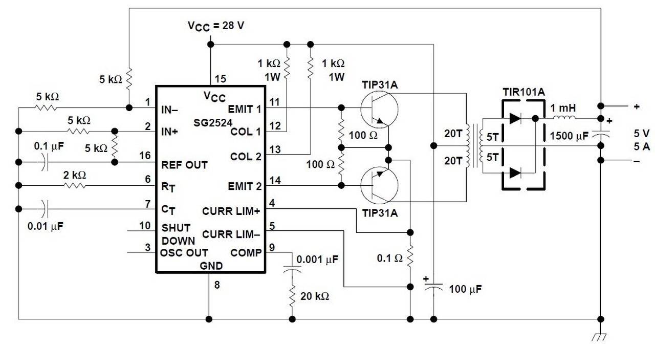 Szia. Találtam SG3524-es kapcsolást. Asszem ez jó is lenne a CO-hoz, némi módosítással Viszont arra figyelni kell, hogy az SG3524 max 100mV-ot visel el az i-sense bemenetei közt. És módosítani kell a kimeneti fesz visszacsatoló ellenállásait is, meg egy potit is be kell rakni oda. De ez csak a táp része, ezen kívül még azért a CO-hoz kell néhány dolog. Pl nem tudom inek mi a szimpatikus a feszültség kapcsolására, mármint a pisztojra. Mágneskapcsolós, vagy tirisztoros kapcsolás, plusz kell még egy toló motor elektronika is. Ki lehetne esetleg egészíteni még impulzus hegesztés üzemmel is. Feszültség, áram kijelzés. Hővédelem kielzése meg még egyéb finomságok. Meg lehet csinálni analog módon is de akár pic-el is ezeket a dolgokat. Én semély szerint piccel egyszerűbbnek tartom ezeket. Ha van PWM generátora a picnek, akkor még a tolómotor sebességét is lehet azzal állítani. A/D-ket lehetne használni a beállításra (előtolás, impulzus üzemnél állítani az impulzus és szünet hosszát, ....) Persze ezeket meg lehet oldani akár 555-el is.