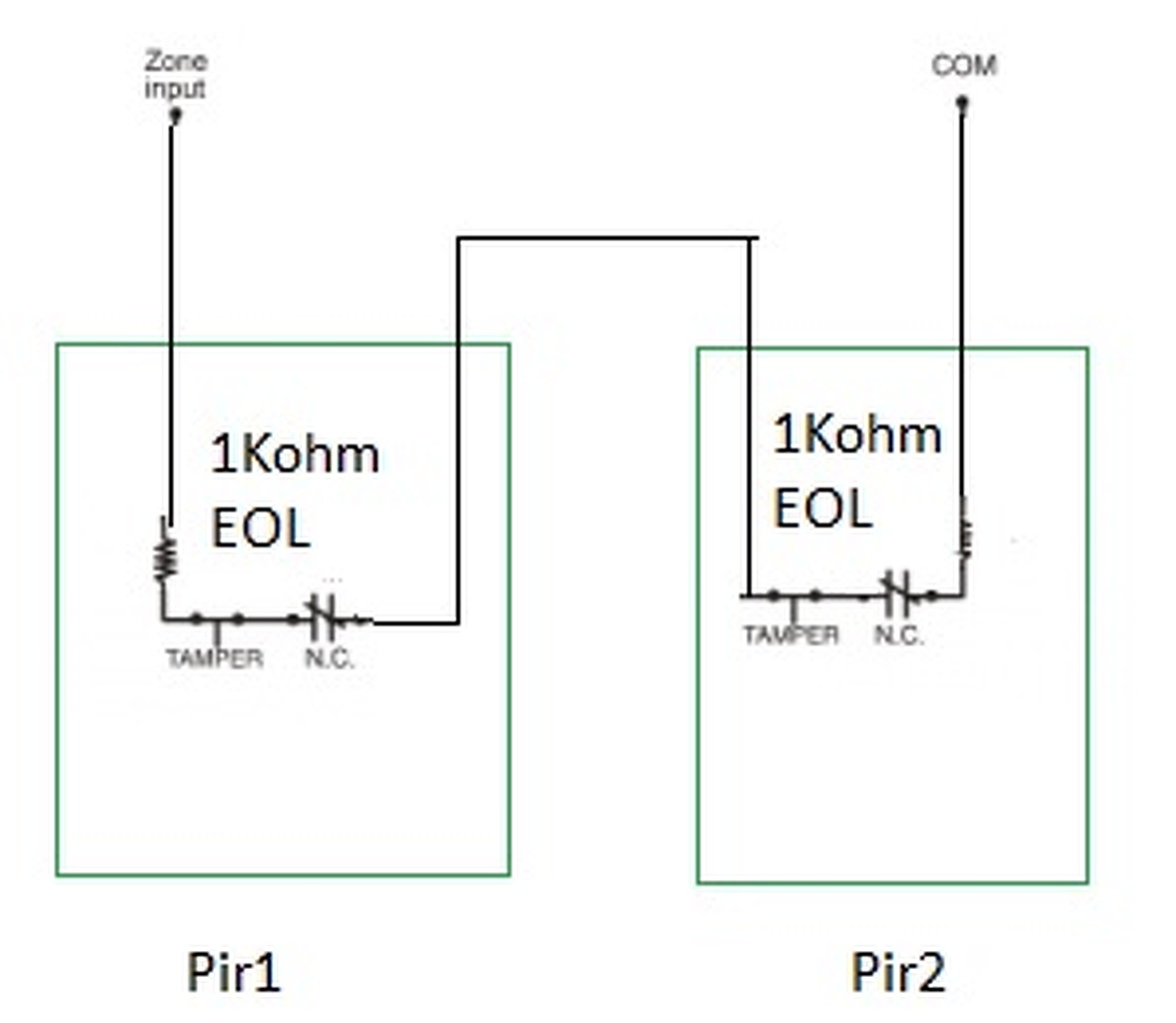A DEOL a dupla lezáró ellenállás. Ezt akkor használjuk, ha egy fizikai zónára két érzékelő megy. Két ellenállás értékkel megkülönböztetjük a két érzékelőt (ha tudja ezt a funkciót a központ). Két érzékelőt egy zónára úgy köthetsz, hogy sorba kötöd őket (kontaktusokat). Legjobb megoldás esetén az EOL ellenállást két kettőre cseréled (2,2kohm/2=1,1kohm, ami 1kohm gyakorlatban). Minden érzékelőben az eredeti módon sorbakötsz egy ellenállást a kontaktussal. Miért jó ez? Lásd a mellékelt képet. Kisebb esélye van egy olyan zárlatnak, ahol látszik a körben az EOl, de nem jelez a PIR. (Lehet, hogy nálad az érzékelők tamper köre külön zónára megy. Egyébként az a korrektebb megoldás, mivel az eleht 24 órás zóna).