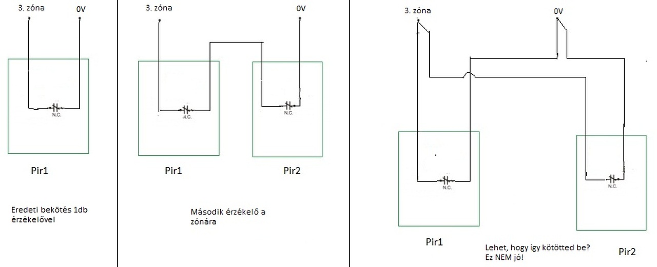 A zóna bekötés, ha jól értettem meg a leírásod, akkor nem fog működni így. Nézd meg a csatolt képet. Lerajzoltam az eredeti bekötést, ahogy kellene és azt is, ahogy kivettem a leírásodból a bekötést. A zónáknál tehát sem az érzékelőben, sem a központban nincs ellenállás, csak a 0V és TMP között?
