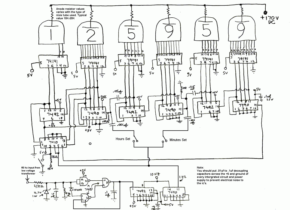 Találtam egy rajzot, a mellékletben benne van, amit szerintem használhatnék, csak némi átalakításra lenne szükségem. Néztem már, hogyan kellene elkészíteni a 170V-os tápforrást, csak azzal vagyok gondban, hogy egyrészt használható e ez a kapcsolás az IN-1eseknél is, illetve, hogy az 1 HZ-et más módon szeretném előállítani.