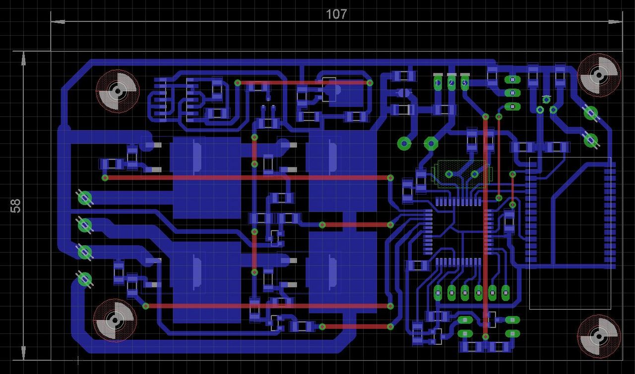 A négy nagy négyzet hűtőfelület 4db SMD teljesítmény FET-nek. Az a baj, hogy akkorák az áthidalások, hogy nem kapni akkora 0 ohm-os elenállást ![]() Átkötéseknél 1,27mm a forrszem, 0,6mm-s fúróval lesz fúrva. Javítom kicsit nagyobbra. Ez egy RC autó vezérlője lesz. (Fetes H-híd, PWM-el meghajtva, ATMega16 vezérlő és egy BT modul, meg táprész) Kiborg