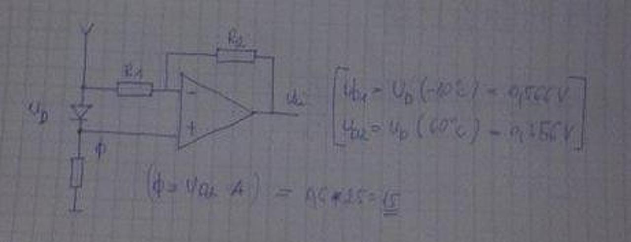 Erősítés 0....100 fok 1 fok az ~1,8mV igy a 100fok az 180mV=0,18V ahhoz hogy 1V legyen a kimenő fesz 1/0,18=5,5555 tehát ekkora erősítés kell. A R1 az 1K ohm akkor a R3 nak 5,555 K ohm nak kell lenni. üdv