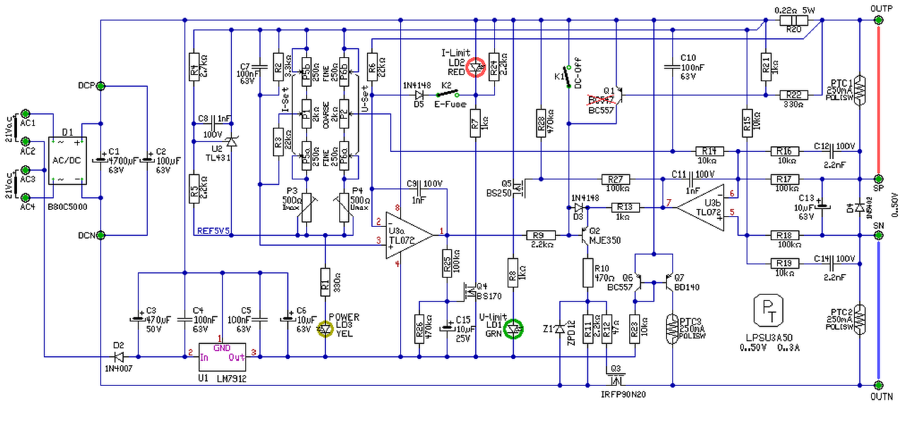 Ez még a legelső rajz amit csináltam. Az áramkorlát LED azért világít, mert nagyobb az AC feszültséged. Semmi baj, az R6 értékének (47kohm-ra cserélve) módosításával orvosolható ez a probléma. A max kimenő feszültség értékét az R14 értékének változtatásával lehet módosítani, viszont meg kellene mérni az IC 1-es lábán mekkora a referencia feszültség.
